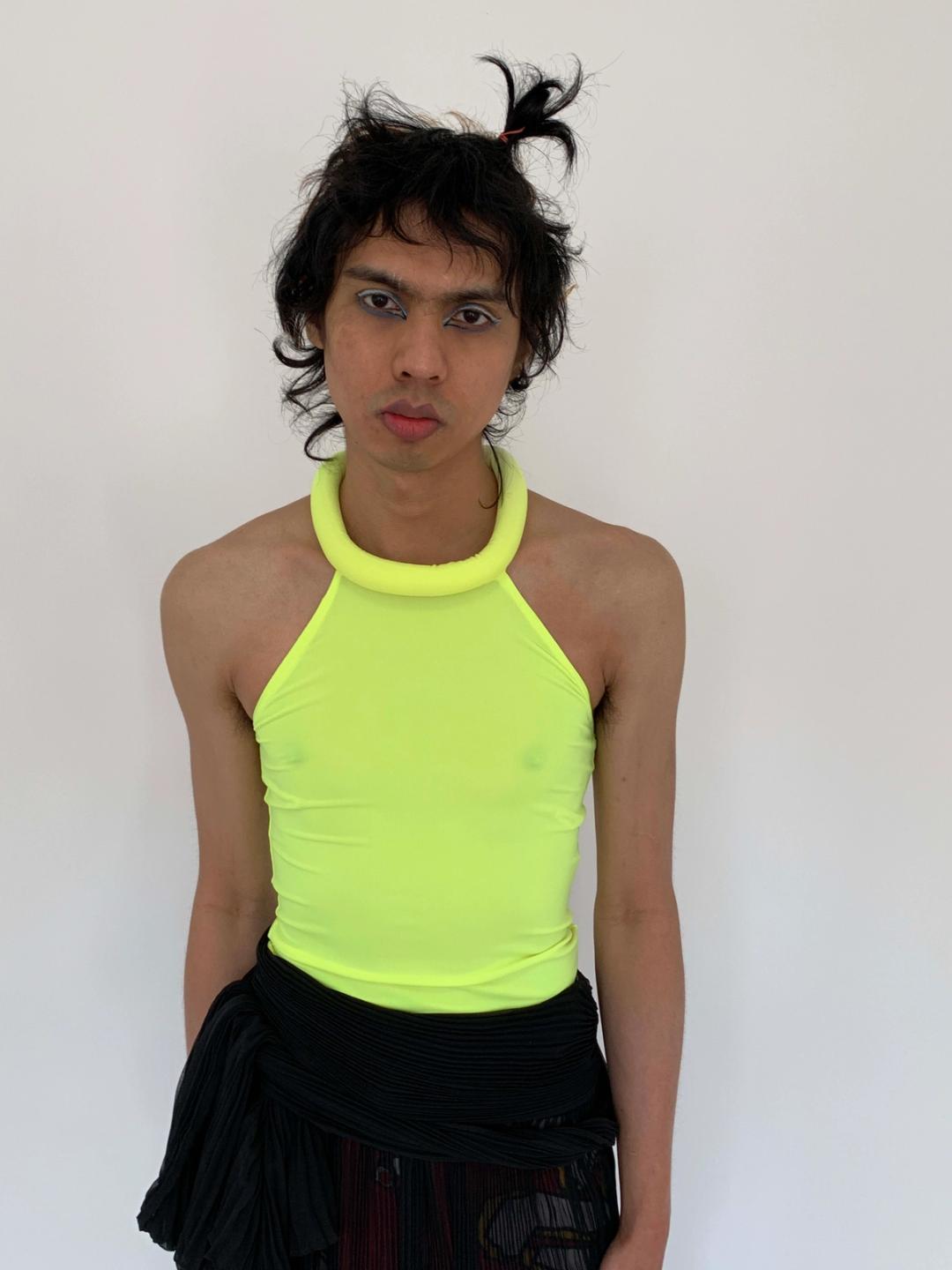 Vintage Cyberdog neon shirt from the early 2000s. The shirt is a dramatic neon color and has a sculptural dimensional collar. The puff collar trails down the back. Stretchy and formfitting silhouette.