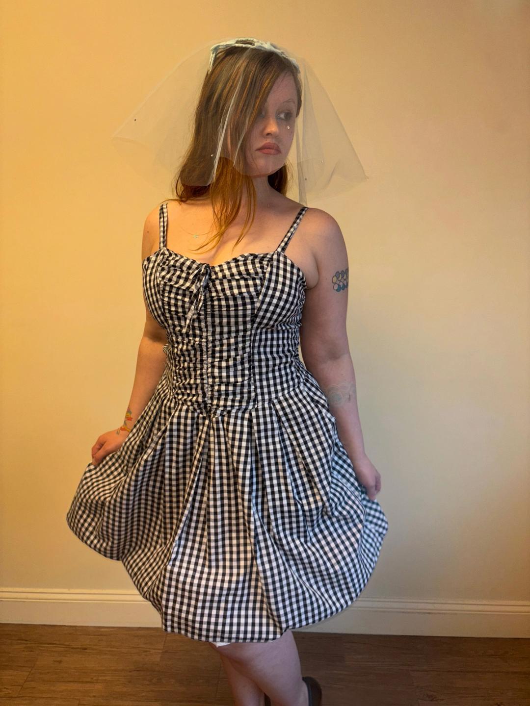 90s gingham dress from France. The dress is unusual as it's a knock off of Chantal Thomass -- the tag imitates the style of hers but says the designer is "Chantal Rosner." It has a shirred bodice and a full skirt with a thin petticoat underneath.