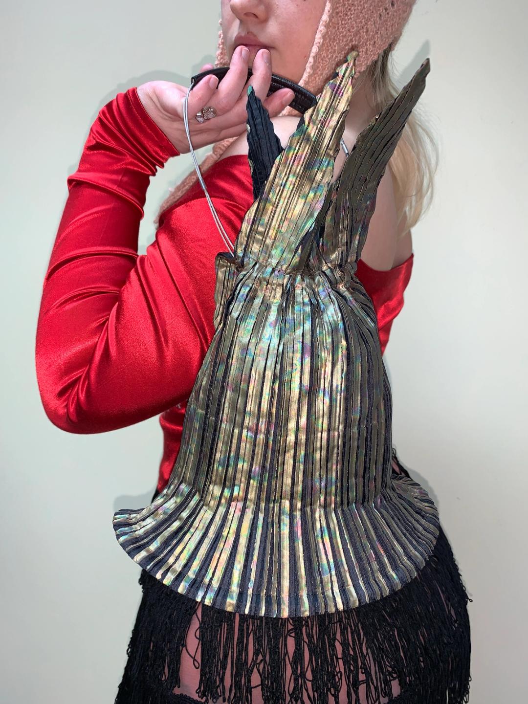 Rare Issey Miyake mainline reticule handbag from the 1990s. It is made from his signature pleating technique is coated in a plasticized material in what almost looks like oil-slick. It has angular fronds around the closure giving it a plant-like appearance. The handle is made from a metal material and it has a leather grip. Perfect condition.