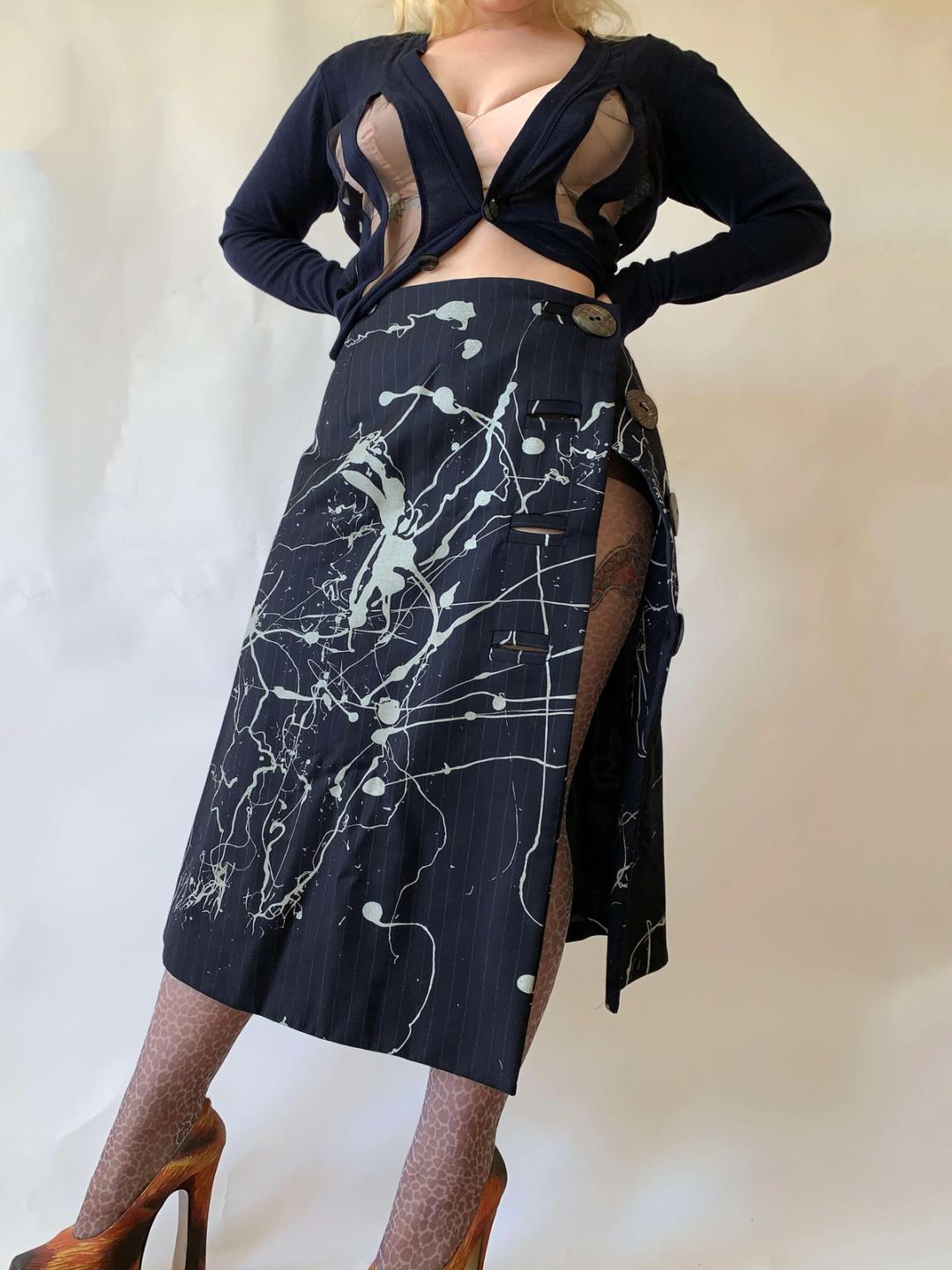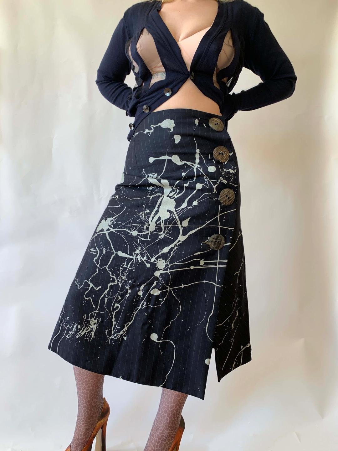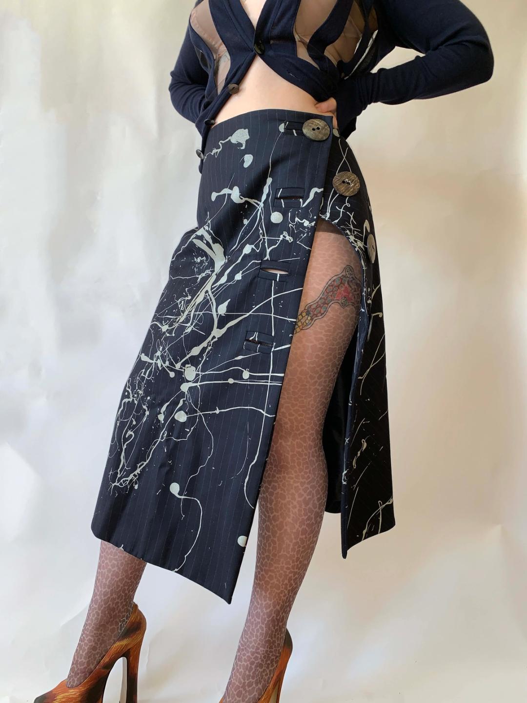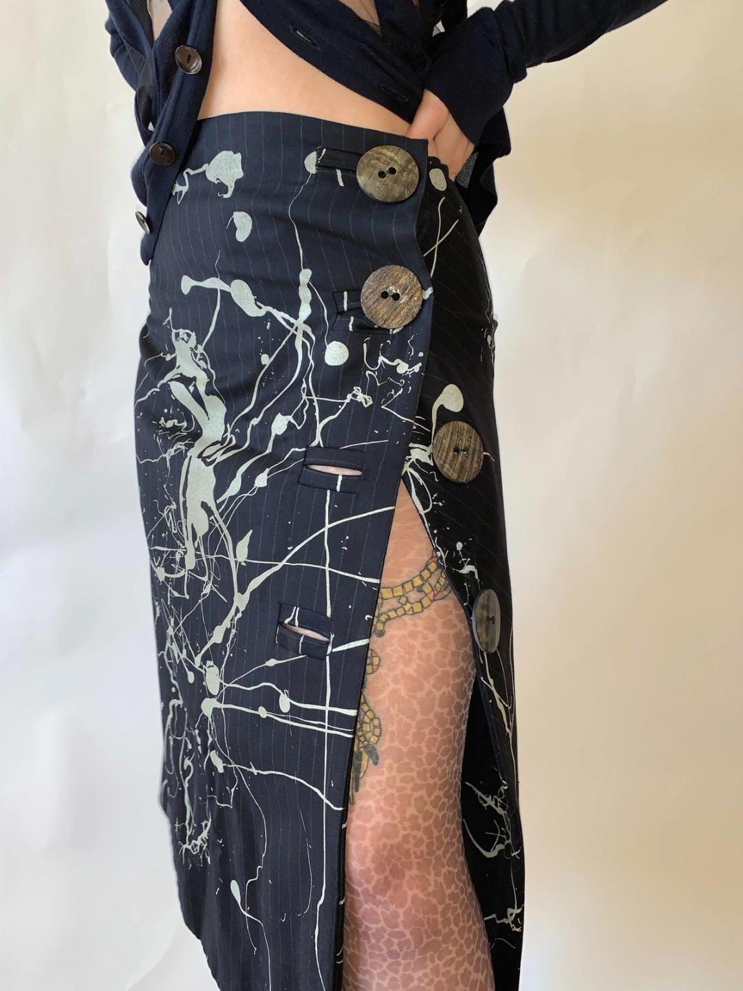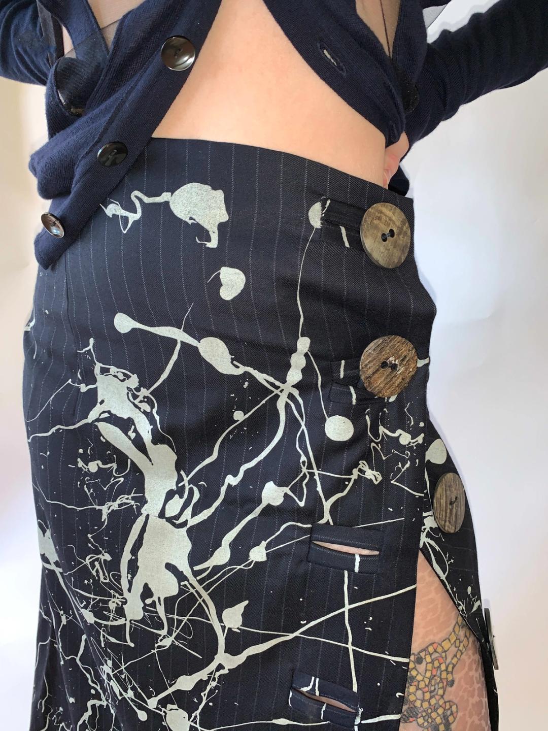 Vintage John Galliano Splatter Pinstripe Skirt w Giant Buttons