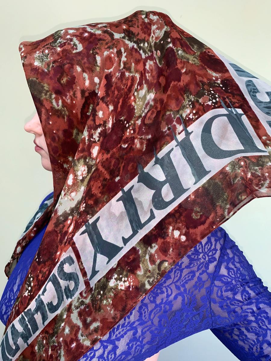 Late 80s or early 90s Junior Gaultier headscarf that says "DIRTY" in English, German, Russian and Italian as well as "SALE." The scarf is made of silk and in excellent condition. It has a floral pattern and the text has an ink smeared effect. Quite large in size.