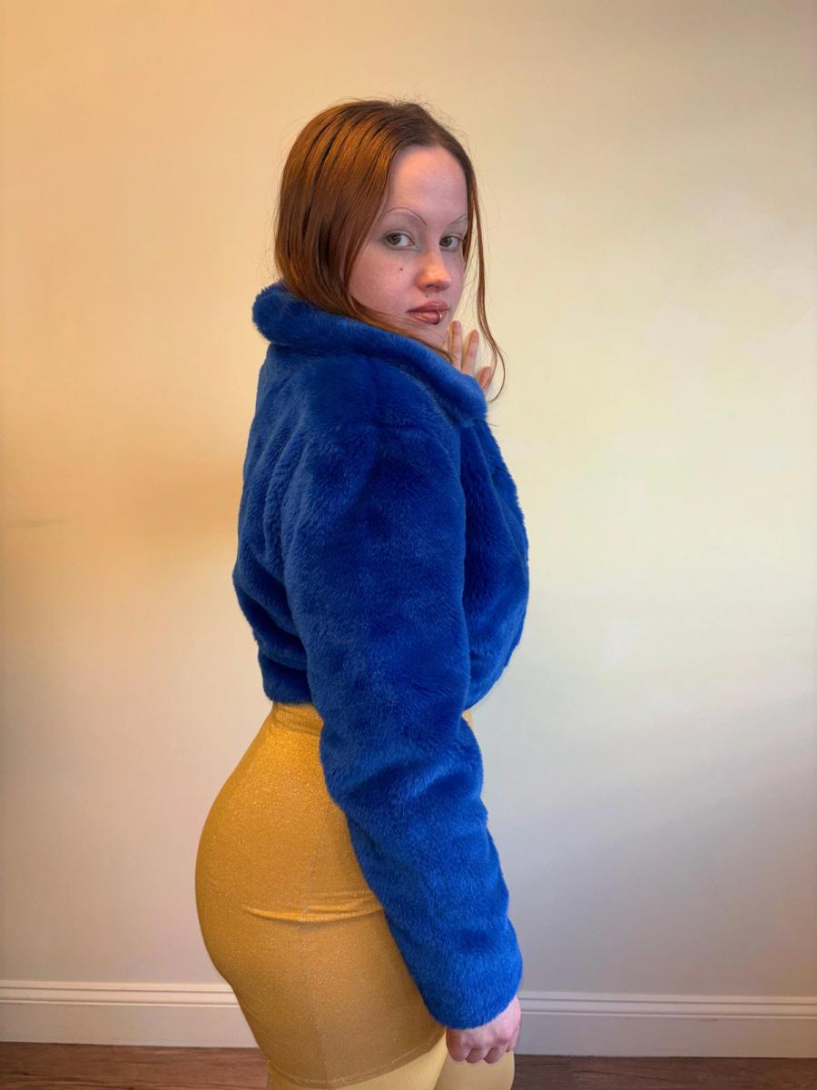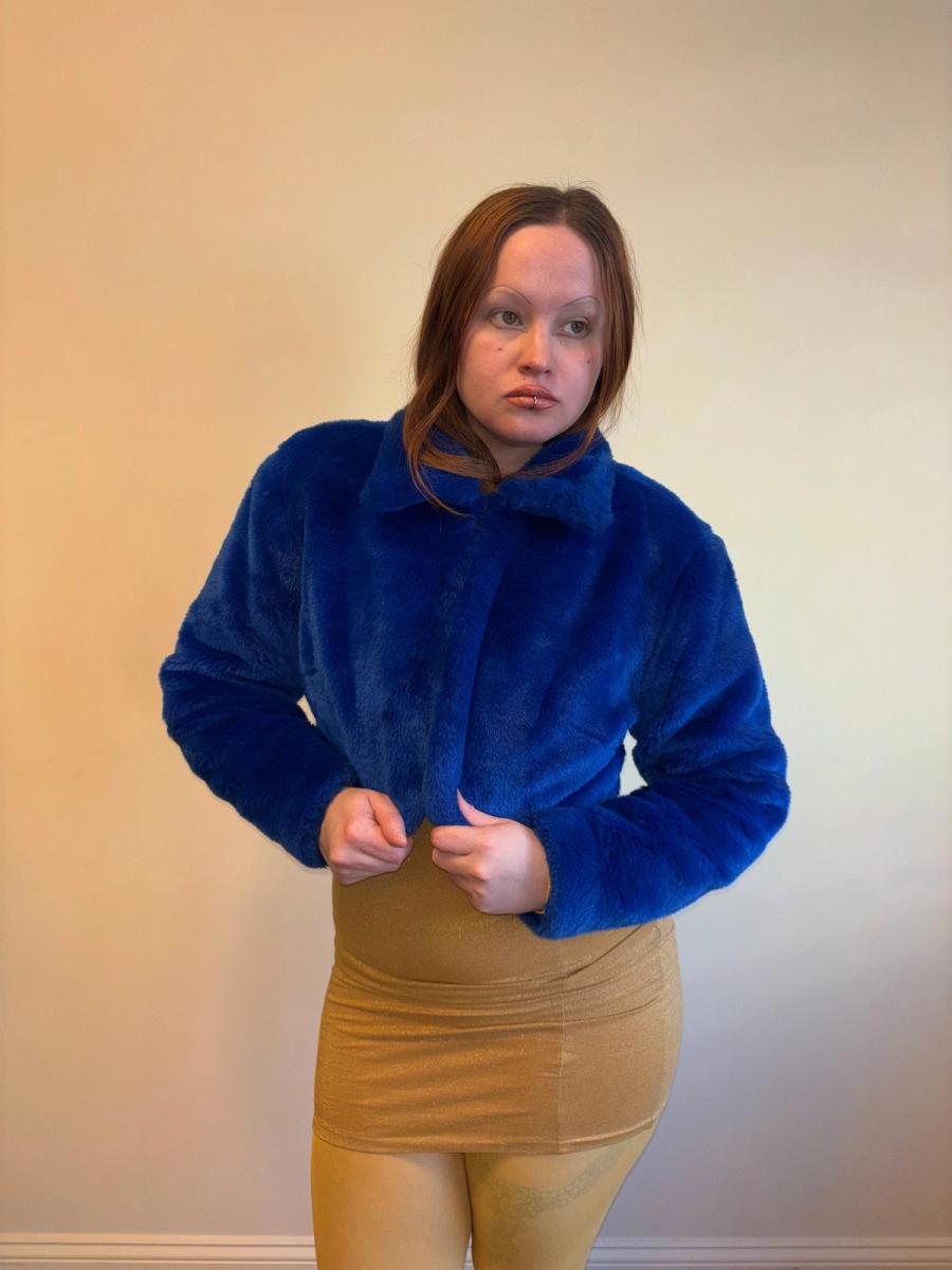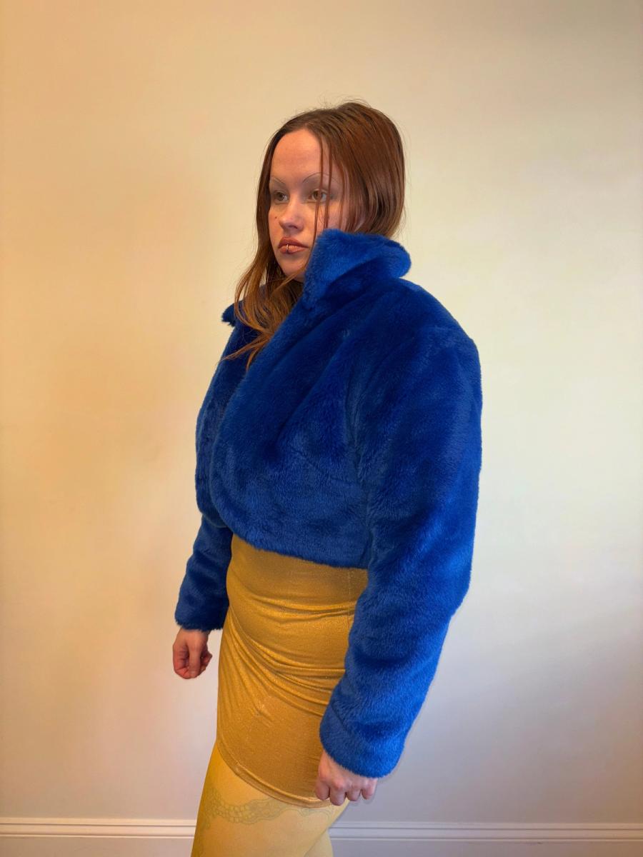 Vintage Norma Kamali electric blue faux fur cropped coat. The coat has a collar and ends flatteringly at the waist. In excellent vintage condition!