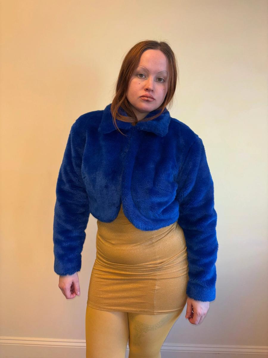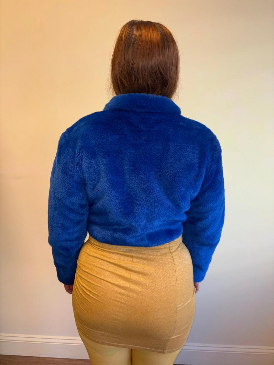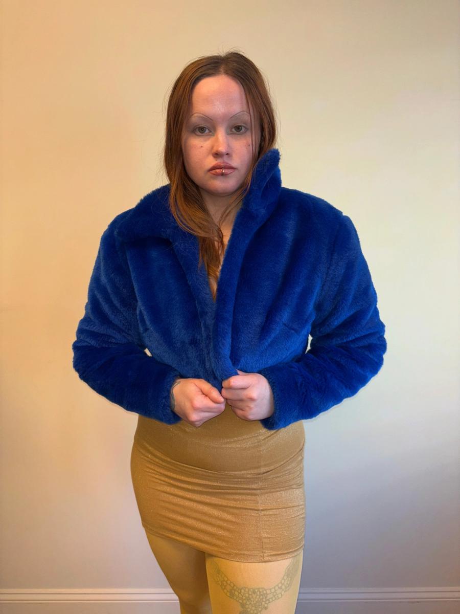 Vintage Norma Kamali electric blue faux fur cropped coat. The coat has a collar and ends flatteringly at the waist. In excellent vintage condition!