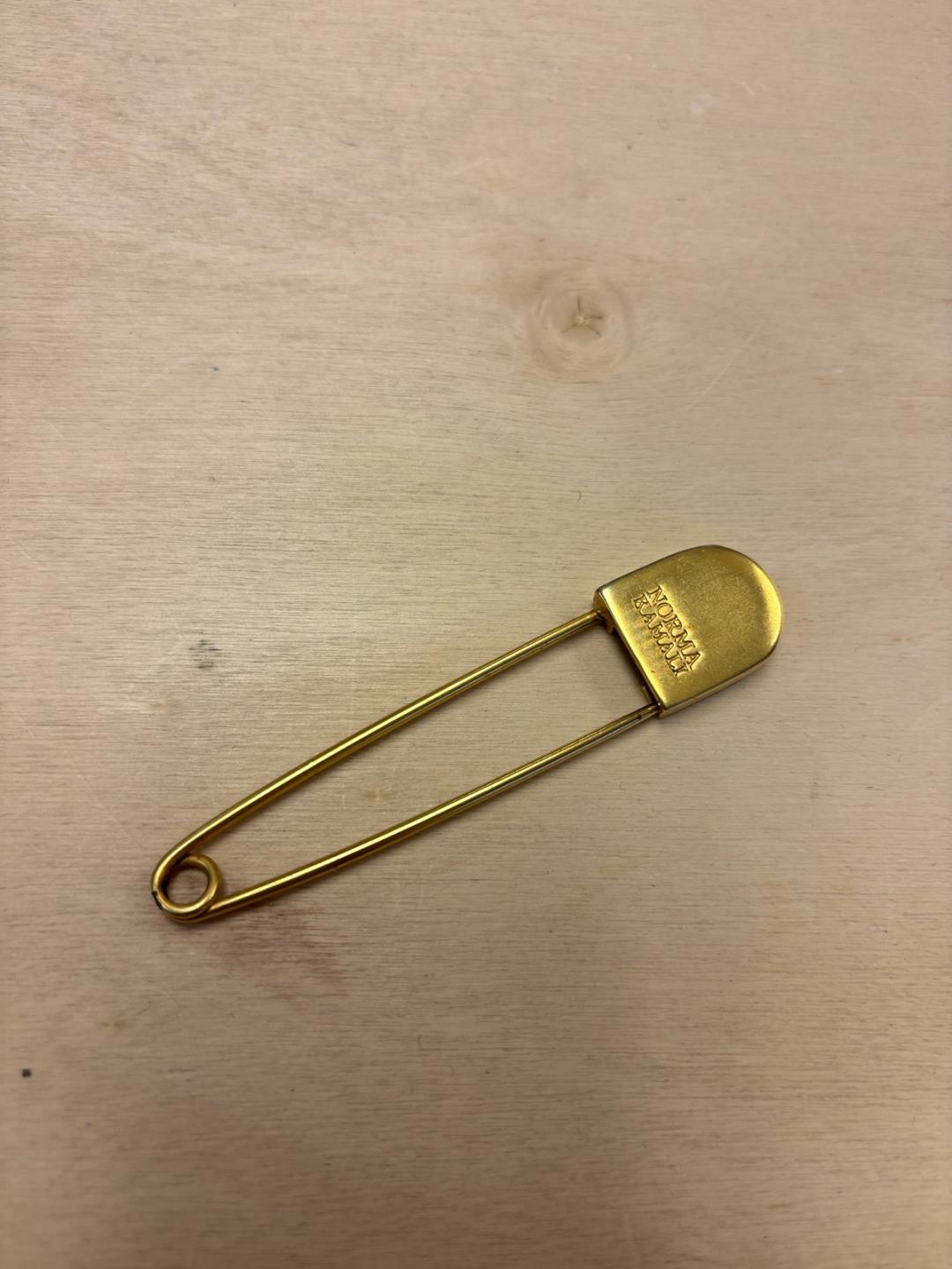 Vintage 80s or 90s oversized brass Norma Kamali safety pin. The pin is functional and has the engraved Norma Kamali logo on the front.