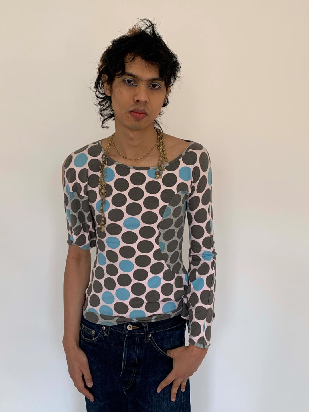 One of a kind shirt by London based brand, Vinti Andrews. The shirt features a dramatic and sculptural attached sleeve. It also has a patchwork design and ribbon ties on one side. Unisex.
