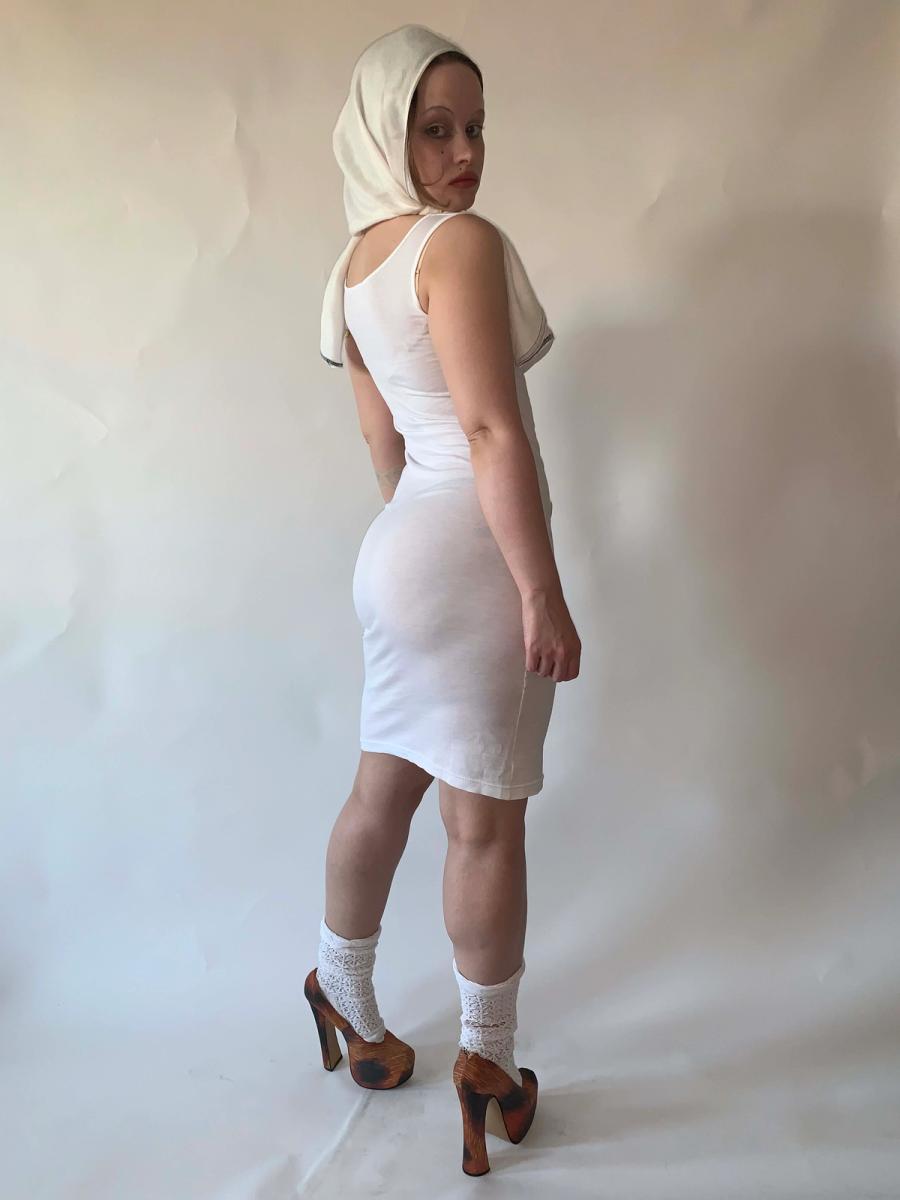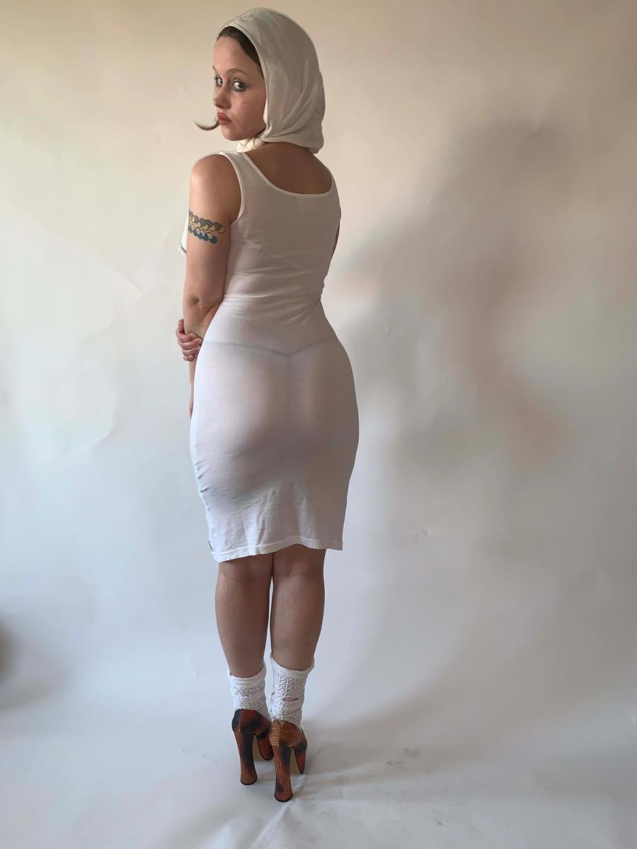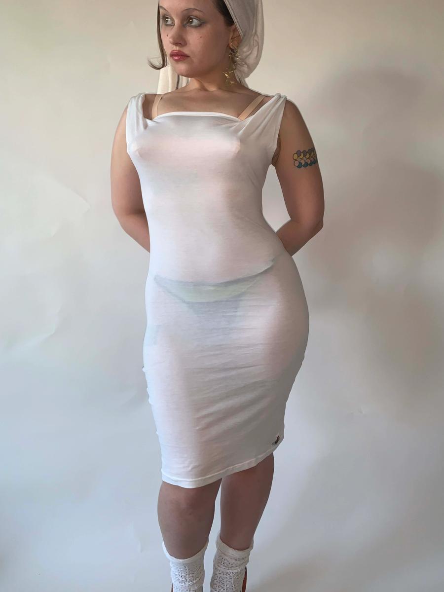 Vintage Vivienne Westwood bodycon T-shirt cotton dress. Features an artfully draped neckline and ultra-flattering fit. This dress is 1990s Gold Label, made in England. It is in impeccable condition, appears unworn. It is labeled size S, but could fit a range of sizes as it has some stretch.