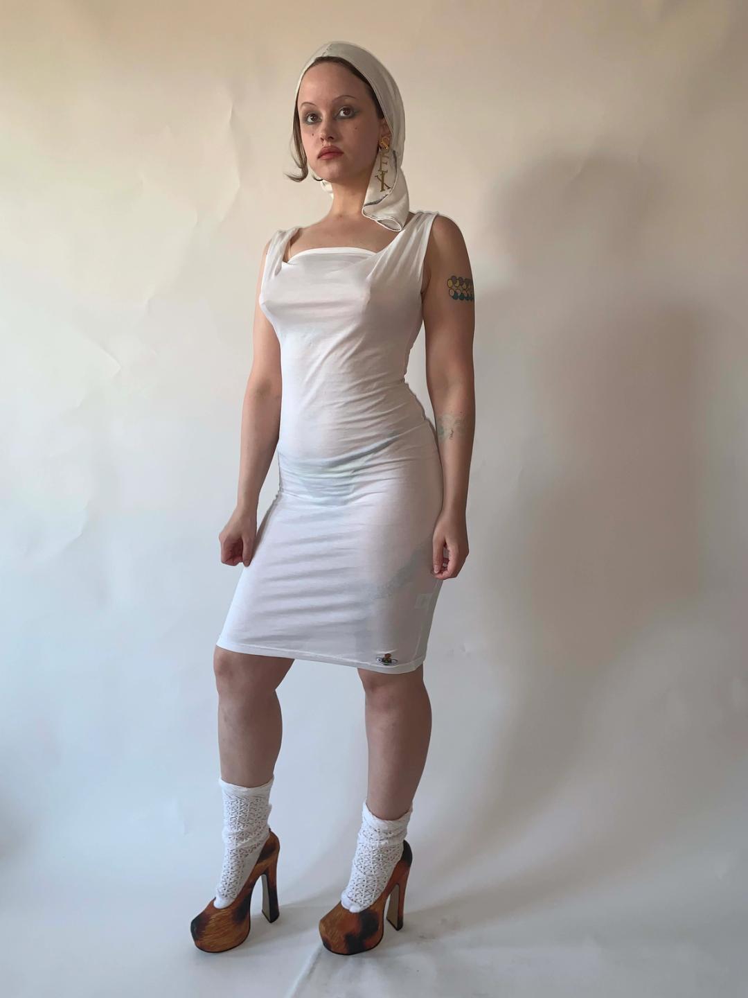 Vintage Vivienne Westwood bodycon T-shirt cotton dress. Features an artfully draped neckline and ultra-flattering fit. This dress is 1990s Gold Label, made in England. It is in impeccable condition, appears unworn. It is labeled size S, but could fit a range of sizes as it has some stretch.