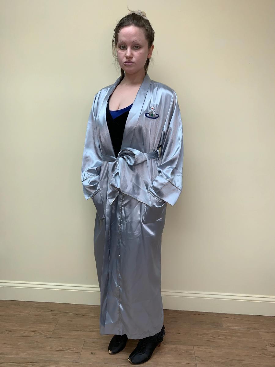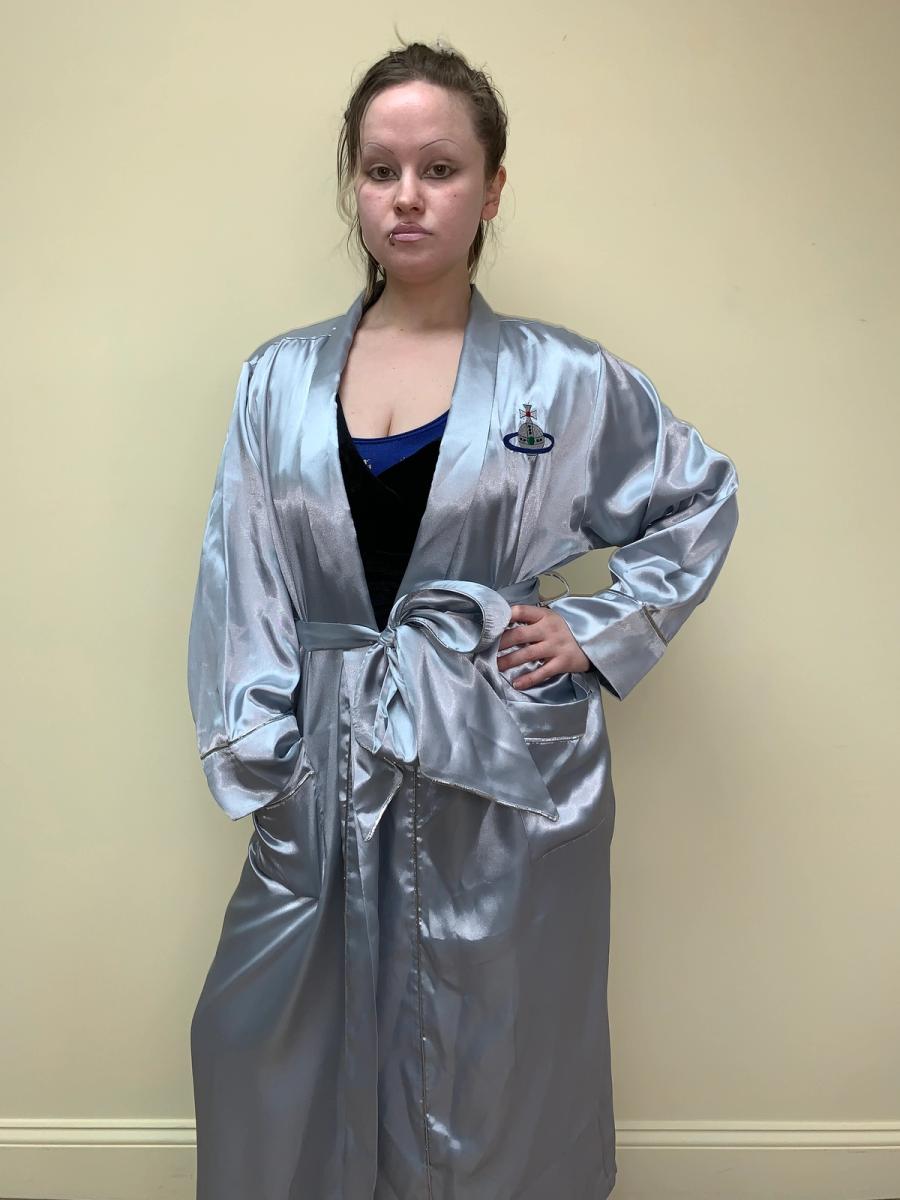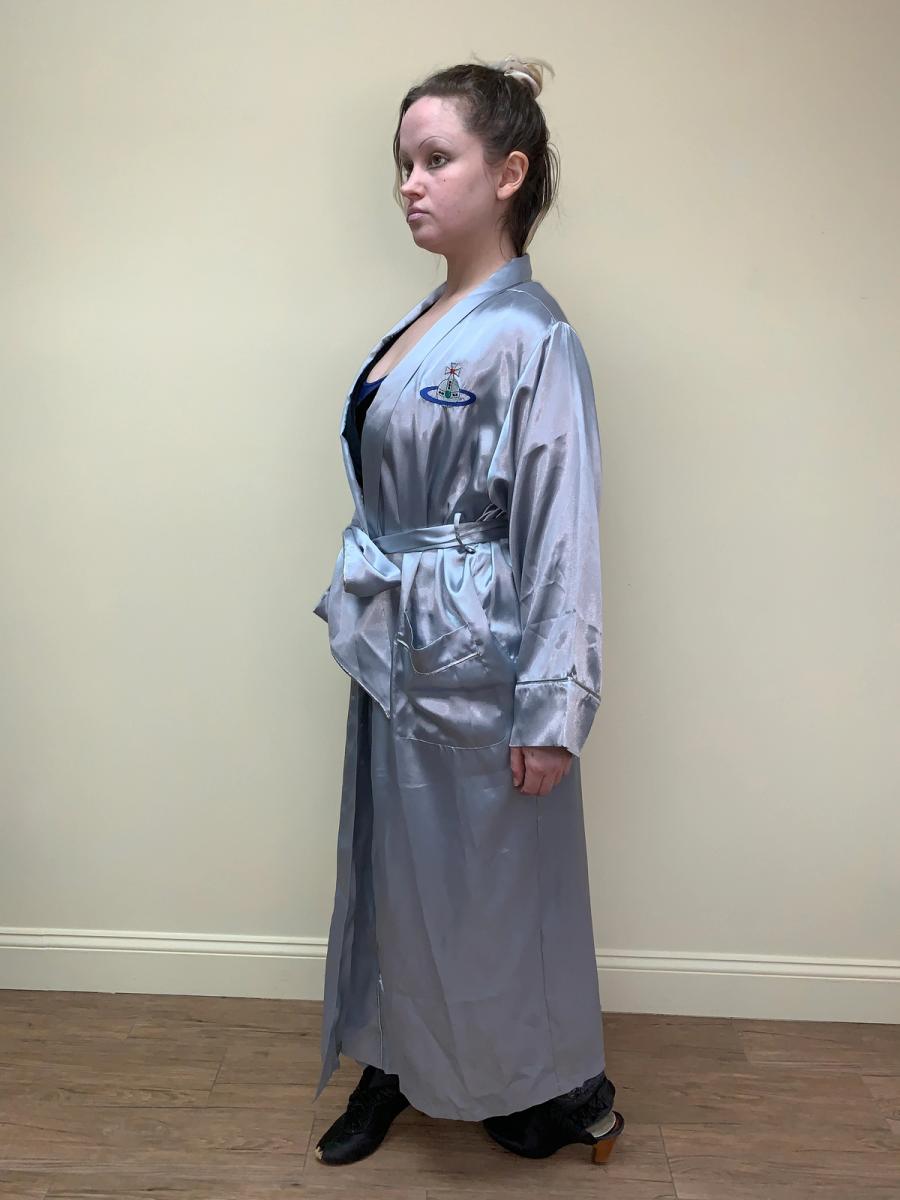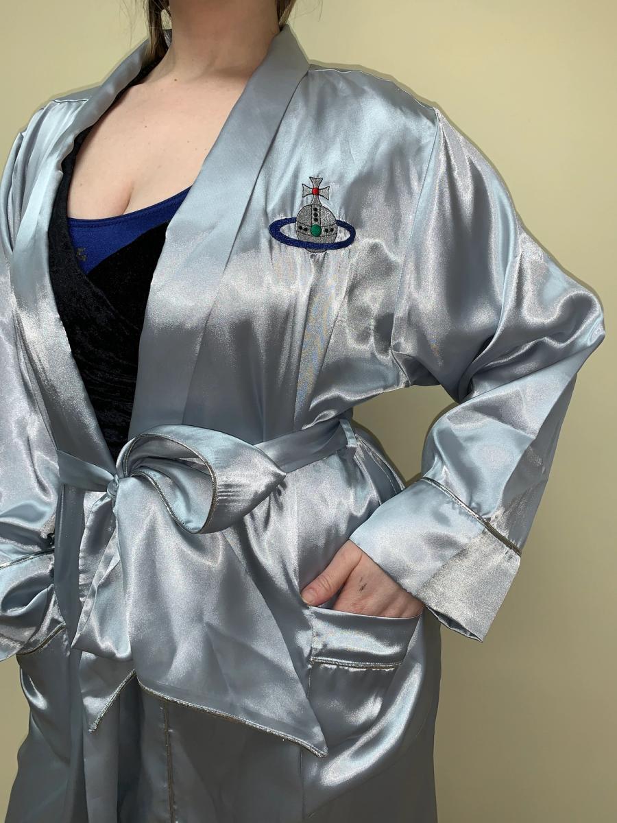Vintage robe by Vivienne Westwood from her 1993 "Grand Hotel" collection. It has a relaxed fit with a belt sash closure. The robe also has a large embroidered orb on front. It has two roomy pockets. Unisex. Quite size flexible.