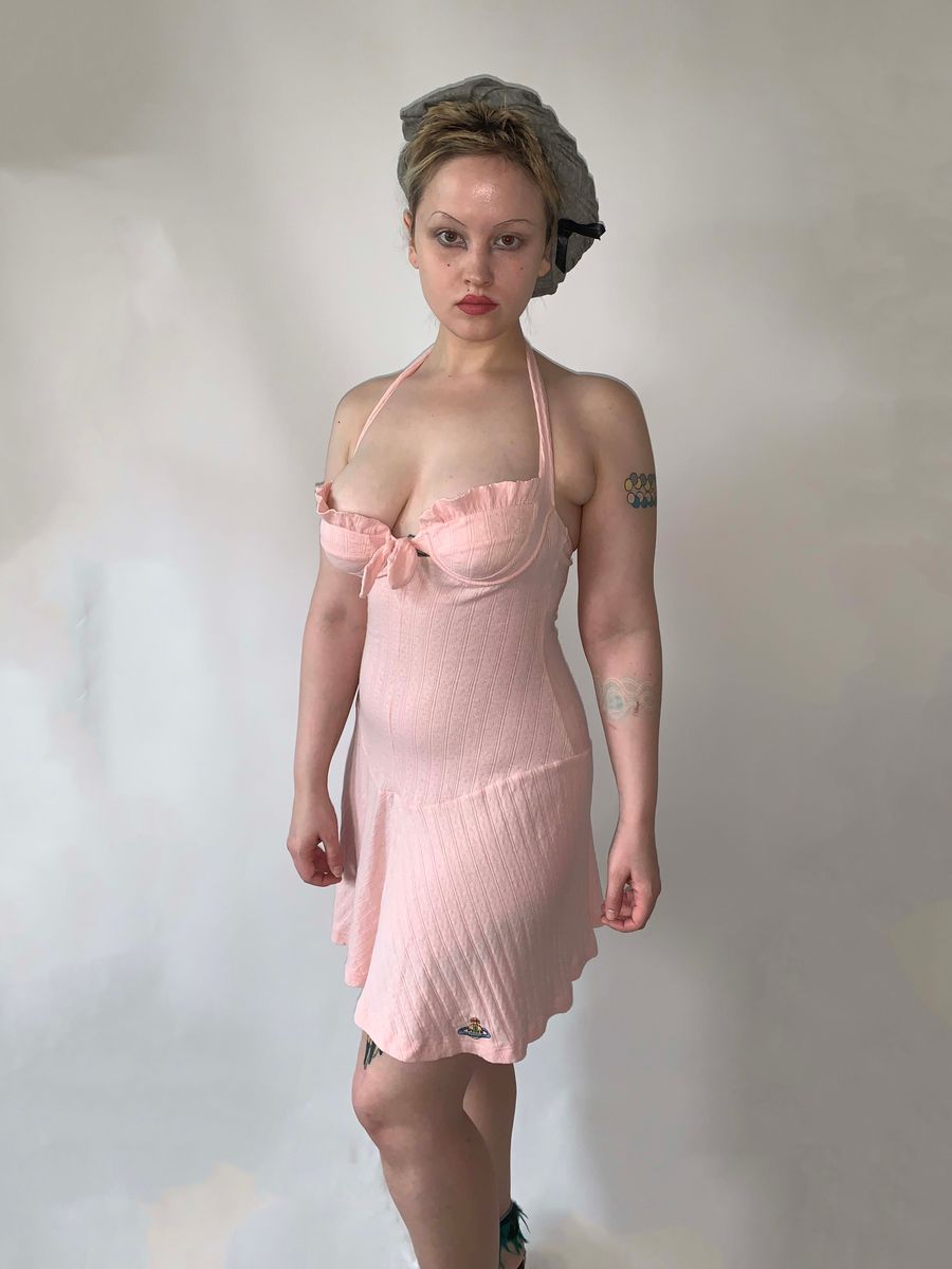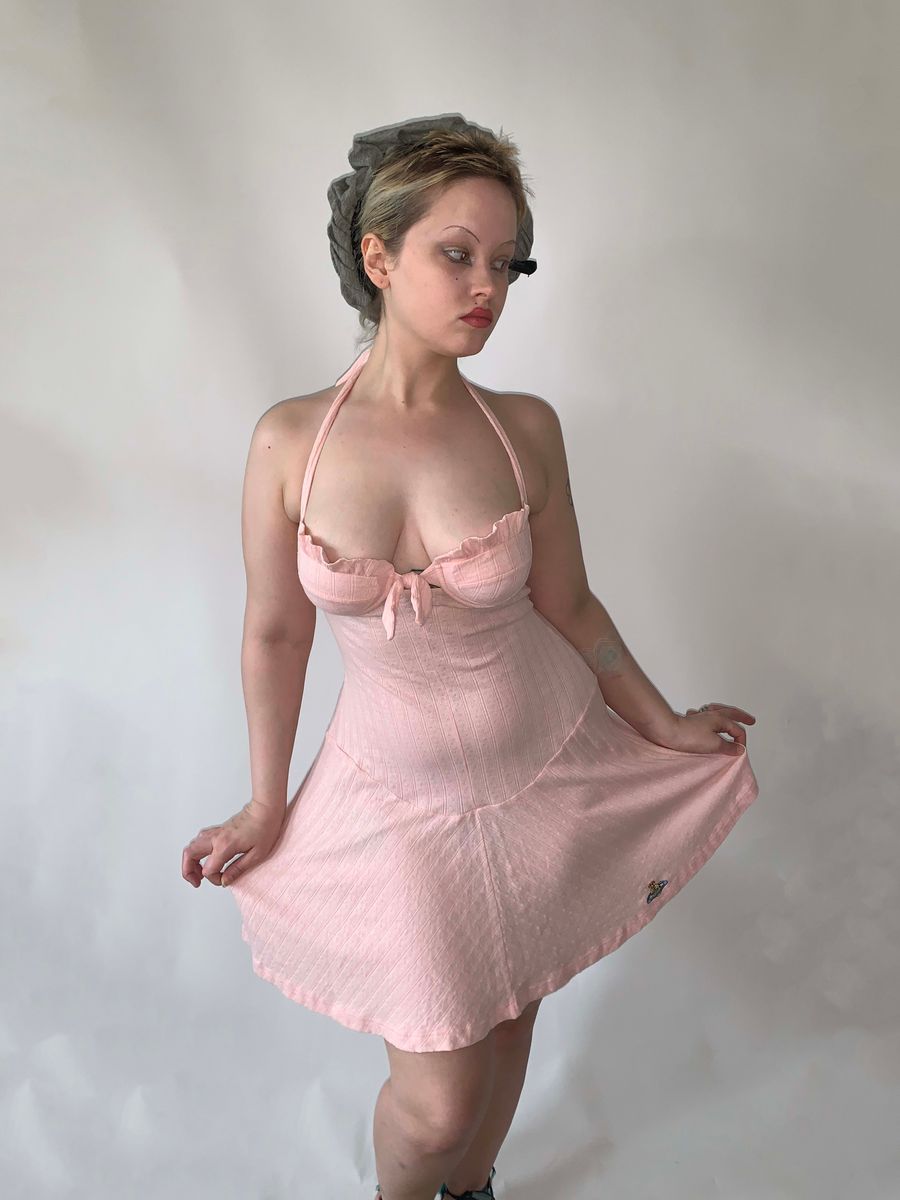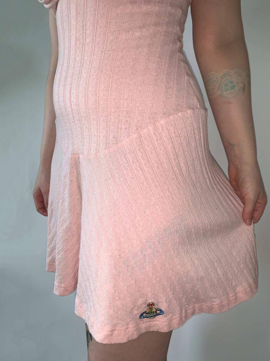 Vivienne Westwood pointelle and ribbed cotton knit halter dress in baby pink with embroidered orb from the 90s Milan era. It has a unique curvilinear drop waist as well as built in underwire and adjustable halter for extra support. Shown on a D cup, but could definitely fit smaller. Pristine condition! Marked size M.