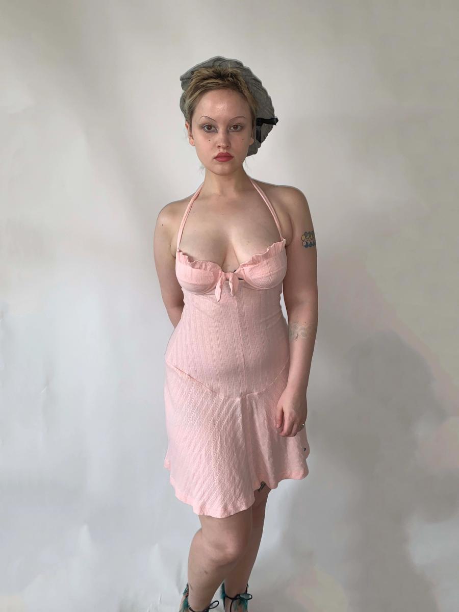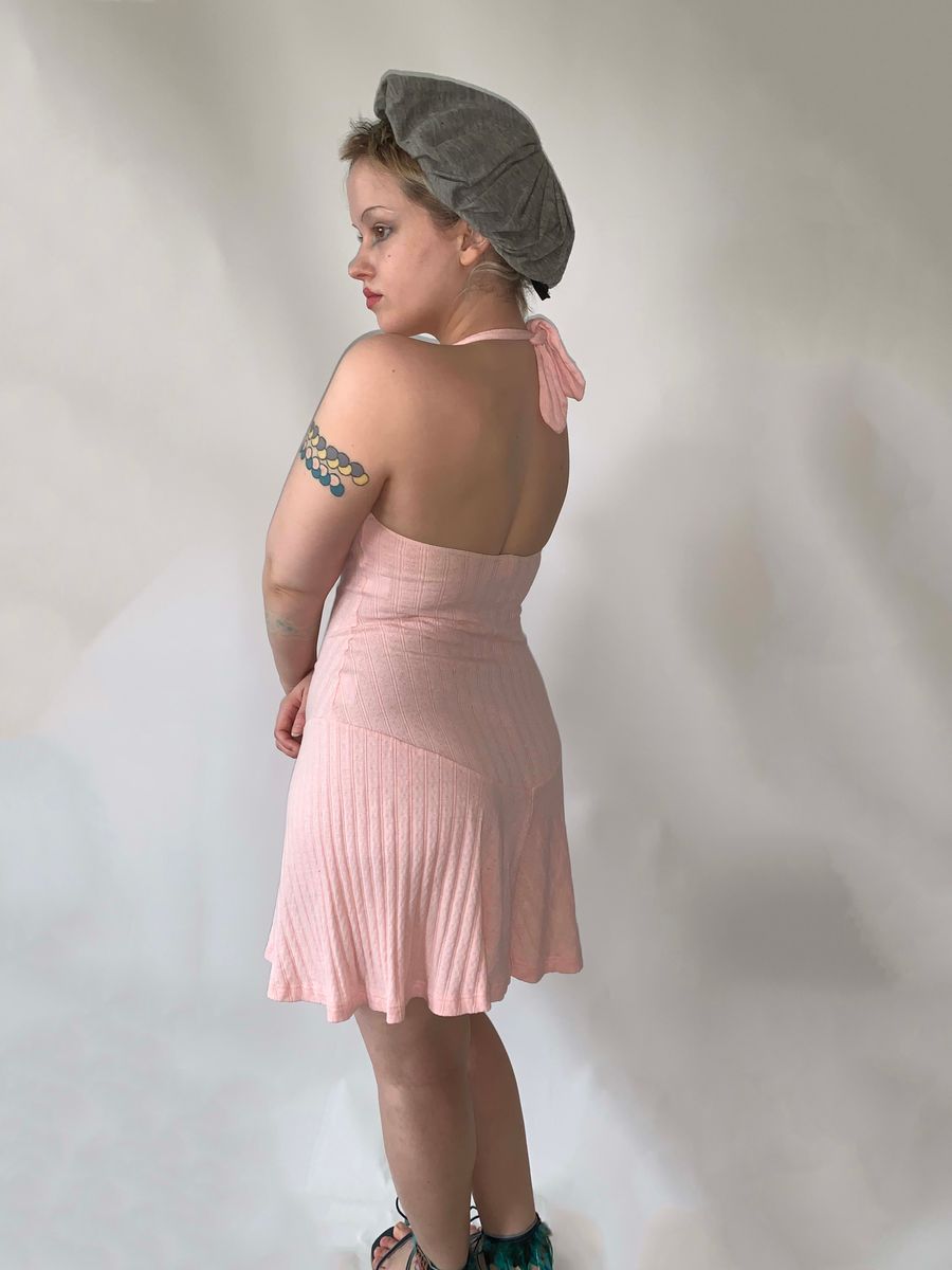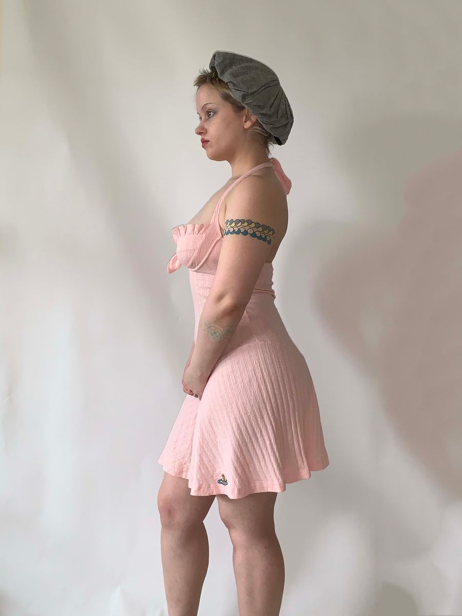 Vivienne Westwood pointelle and ribbed cotton knit halter dress in baby pink with embroidered orb from the 90s Milan era. It has a unique curvilinear drop waist as well as built in underwire and adjustable halter for extra support. Shown on a D cup, but could definitely fit smaller. Pristine condition! Marked size M.