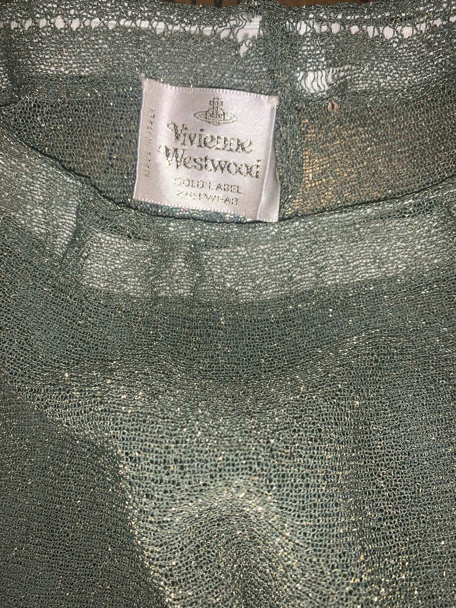 Vintage Vivienne Westwood Gold Label Knitwear circle skirt in green and gold sheer lurex. Chevron pointelle borders near the hem. The skirt is in near perfect condition, no holes or snags on the skirt itself other than some on the inner waistband neat the tag (see photo). Elastic waist measures 12.5" unstretched, the rest is free size.