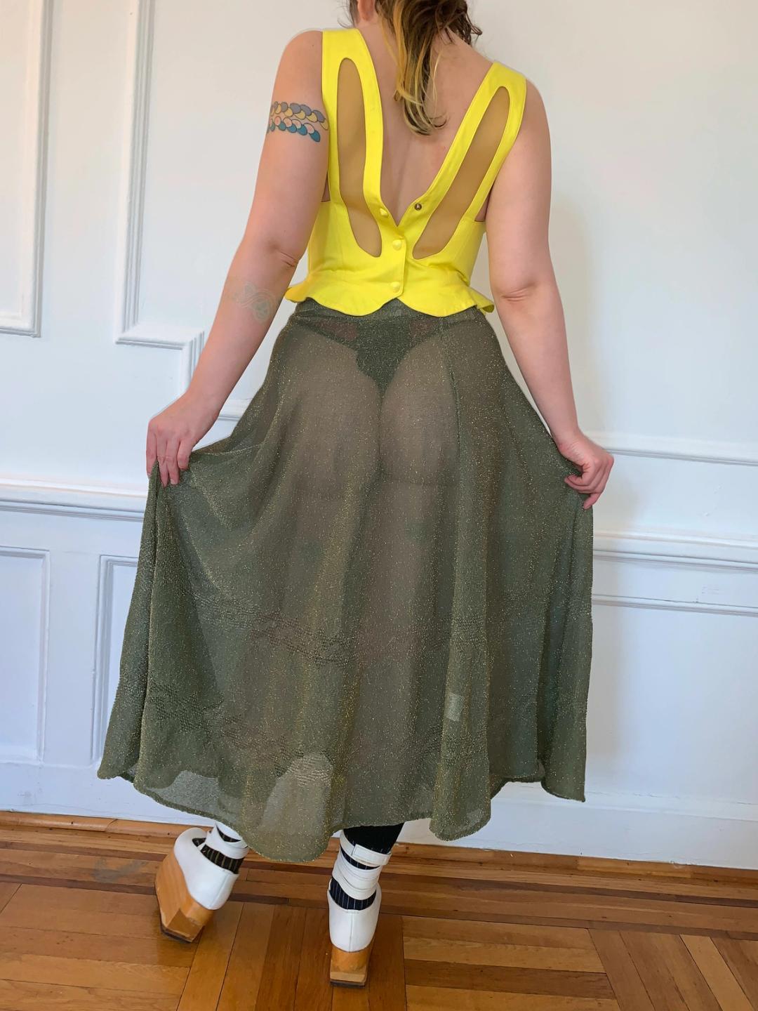 Vintage Vivienne Westwood Gold Label Knitwear circle skirt in green and gold sheer lurex. Chevron pointelle borders near the hem. The skirt is in near perfect condition, no holes or snags on the skirt itself other than some on the inner waistband neat the tag (see photo). Elastic waist measures 12.5" unstretched, the rest is free size.