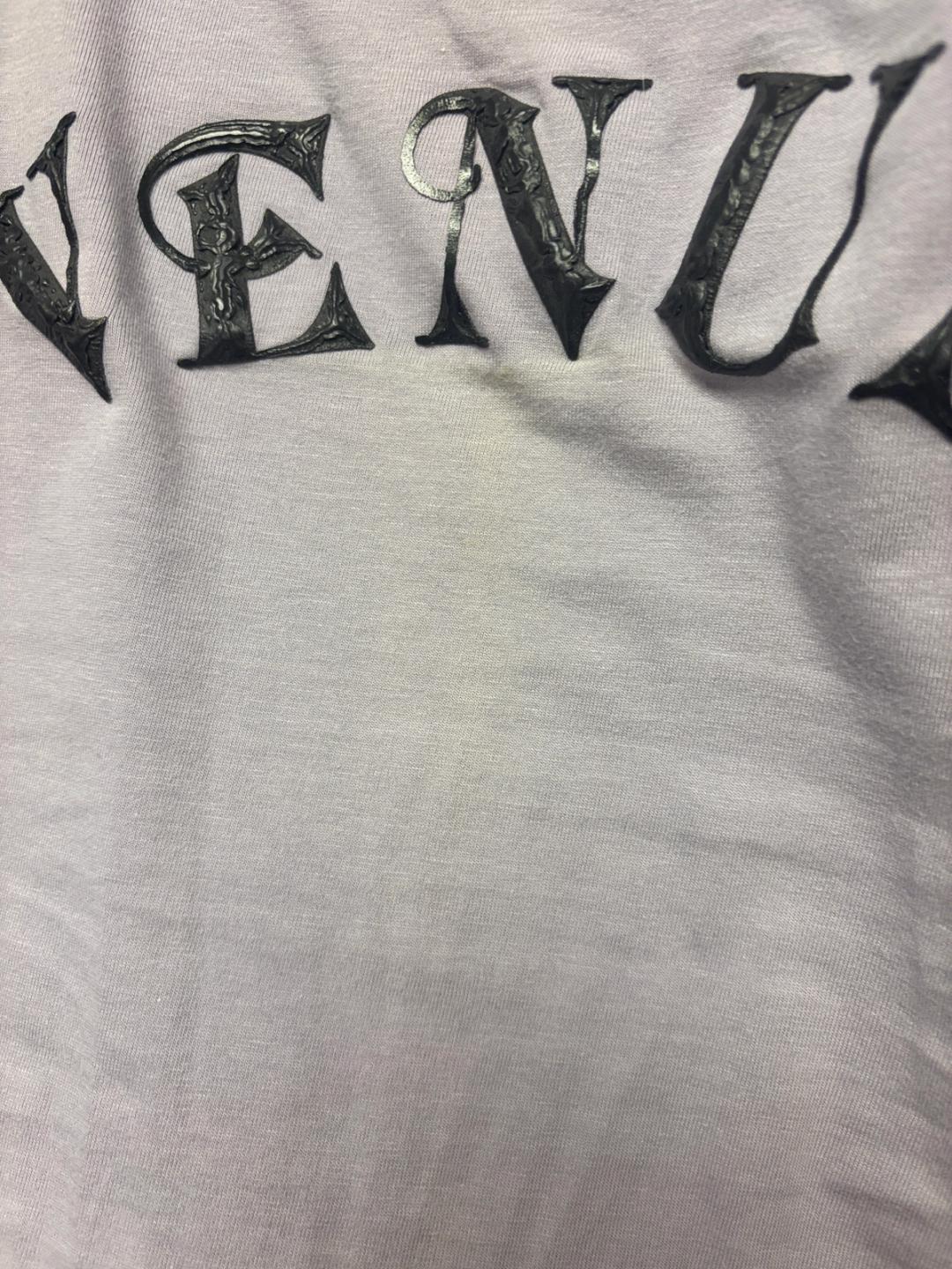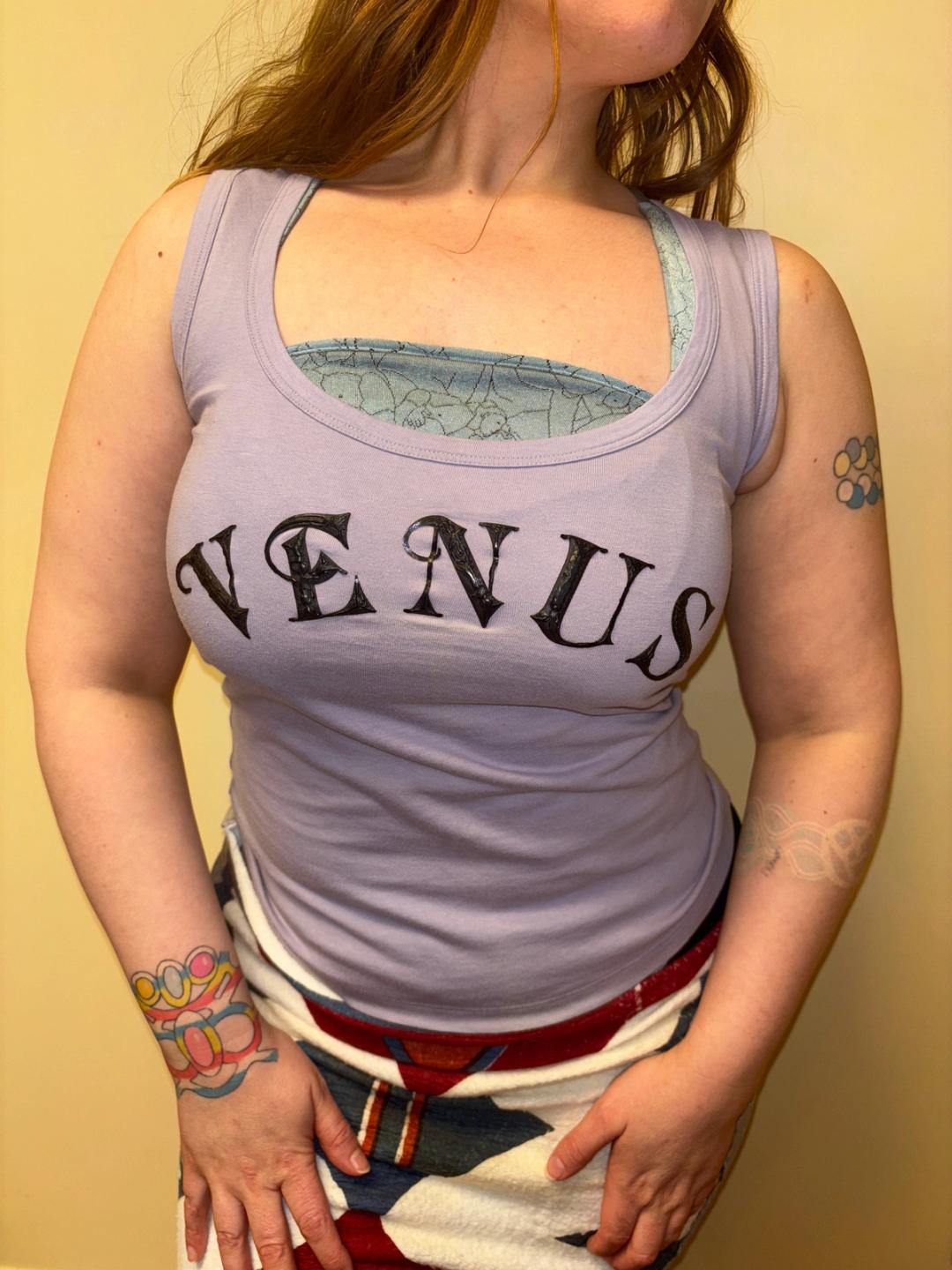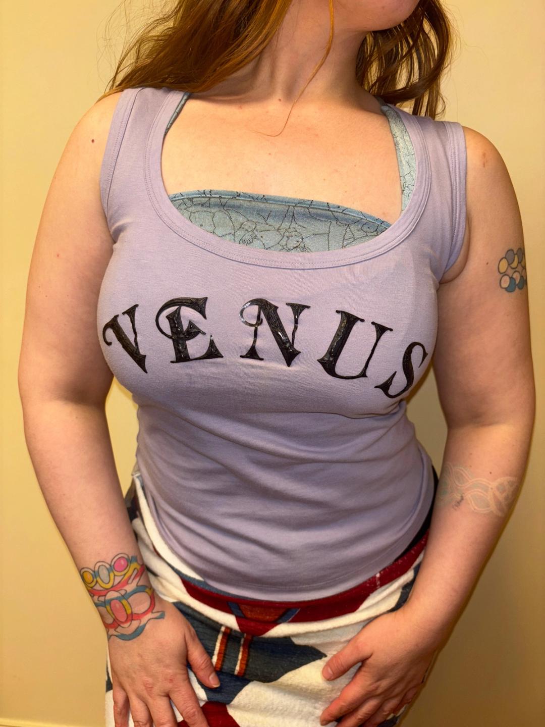 An iconic Vivienne Westwood design, the 'Venus' tank with a flattering scoop portrait neckline, and raised textured text embellishment. The lavender tank is from Vivienne Westwood's Red Label, made in Italy. 100% cotton. There is a faint stain on it - see last image.