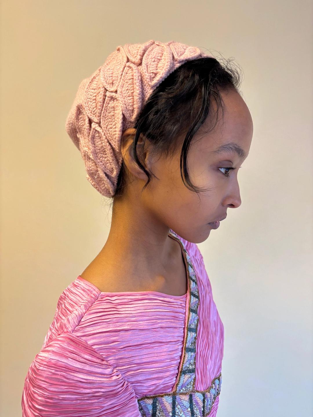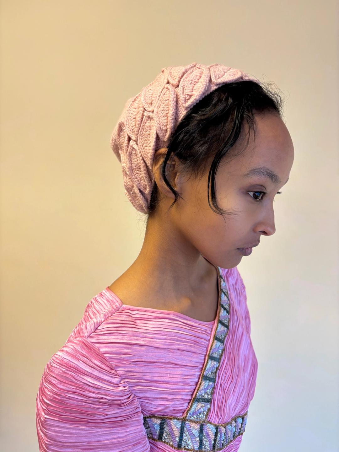 Beautiful Vivienne Westwood pale pink knit hat with dimensional leaves around it. One size fits most.