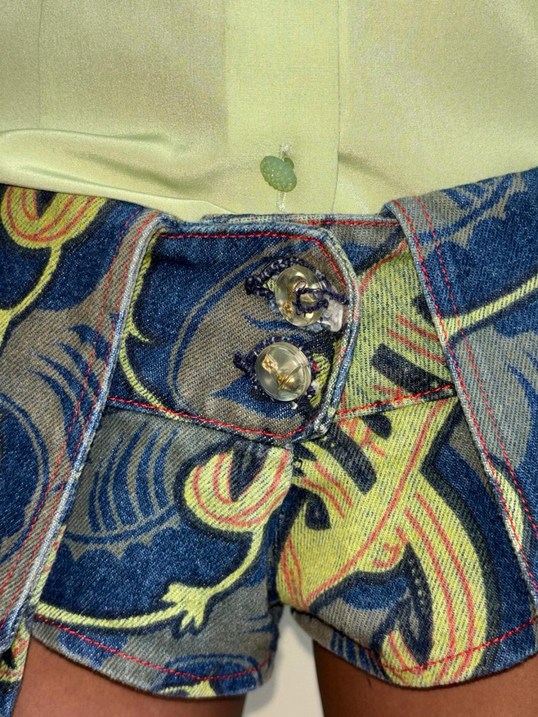 Incredible and extremely rare printed denim micro shorts from Westwood's SS 1993 collection titled 'Grand Hotel'. The print is of swirling outsized paisleys, which was also used in a different colorway in 1991's 'Cut, Slash, & Pull' collection. The giant functioning pockets hang belong the length of the short. The shorts close with rare buttons only seen in the early 90s, a brass orb encased in lucite bauble. These are possibly a runway sample, or the label has been removed. There is some loose stitching on the back and on one of the buttonholes, otherwise in great condition