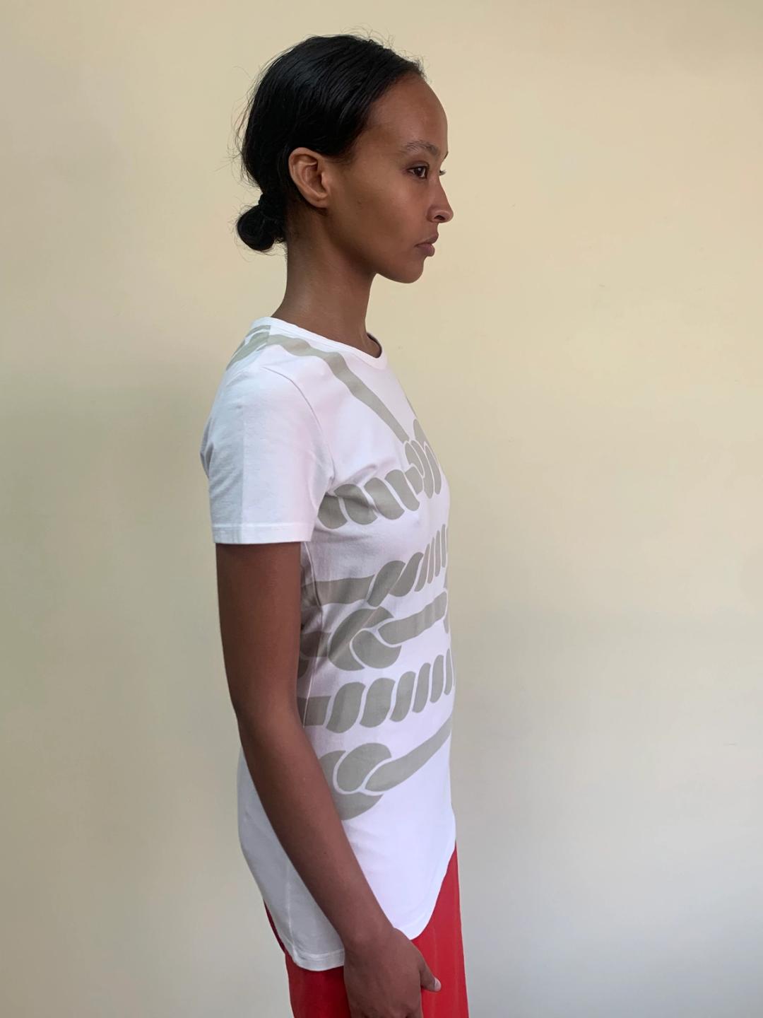 Collection tee from Westwood's SS1998 show. It is a longline cut top in cotton spandex with rope bondage tromp l'oeil print. The label at neck has been removed, otherwise in lovely condition.