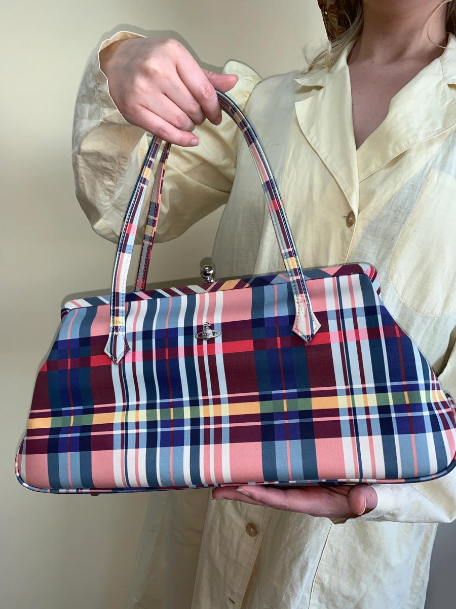 Lovely 90s Vivienne Westwood checked plaid kiss-lock bag in the perfect size. The interior is the classic orb print. In lovely condition apart from a small mark on the side. Not visible when worn.