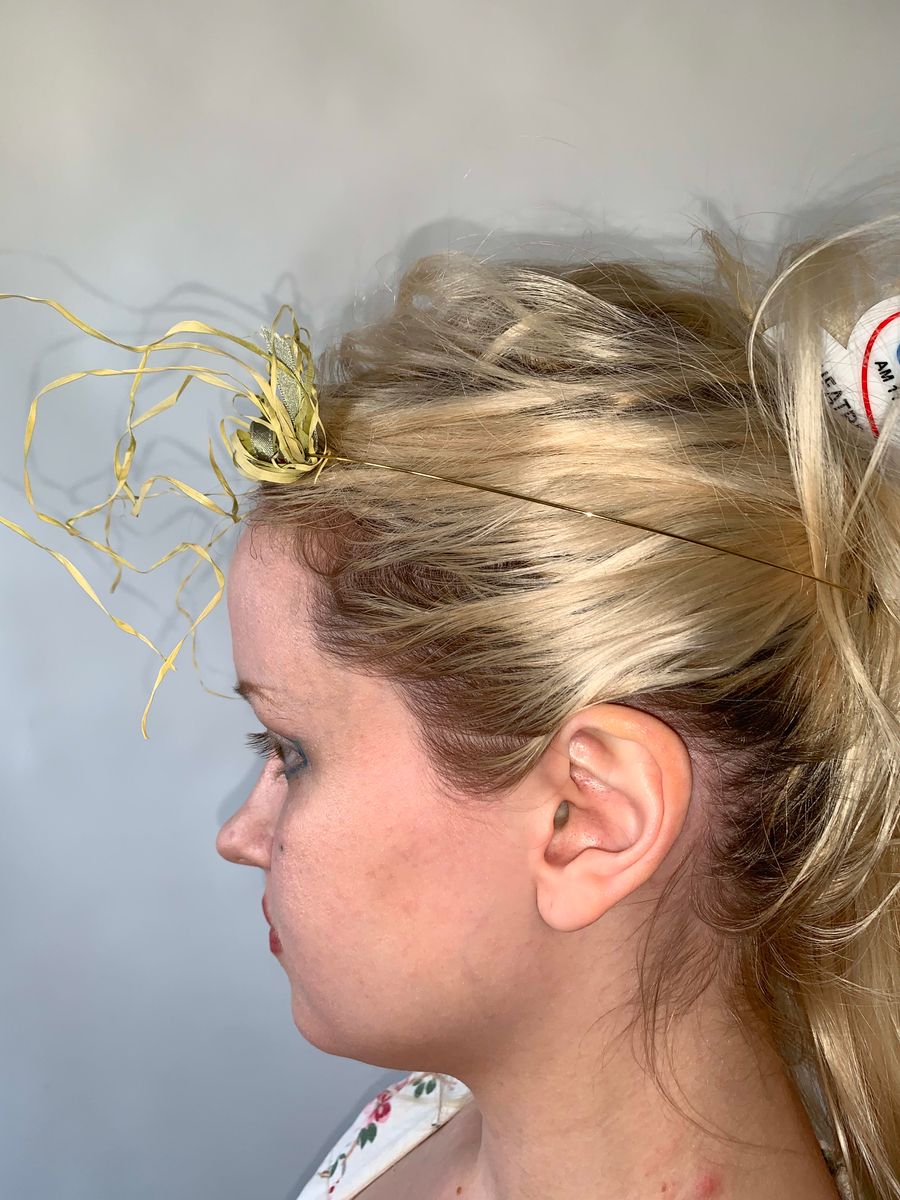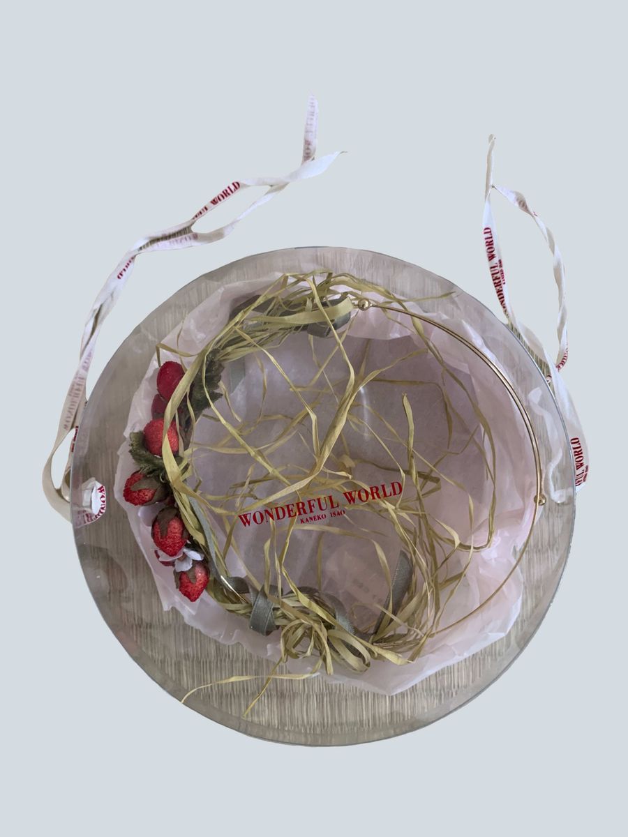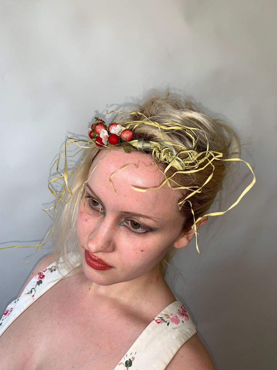 Unique and rare headpiece by Wonderful World presumably from the late 80s or 90s. There are beautiful iridescent berries and flowers amongst strands of raffia. The hair piece is fastened to the head with a light metal band. It comes in the original box! Truly a collector's piece.