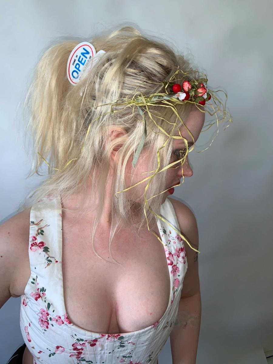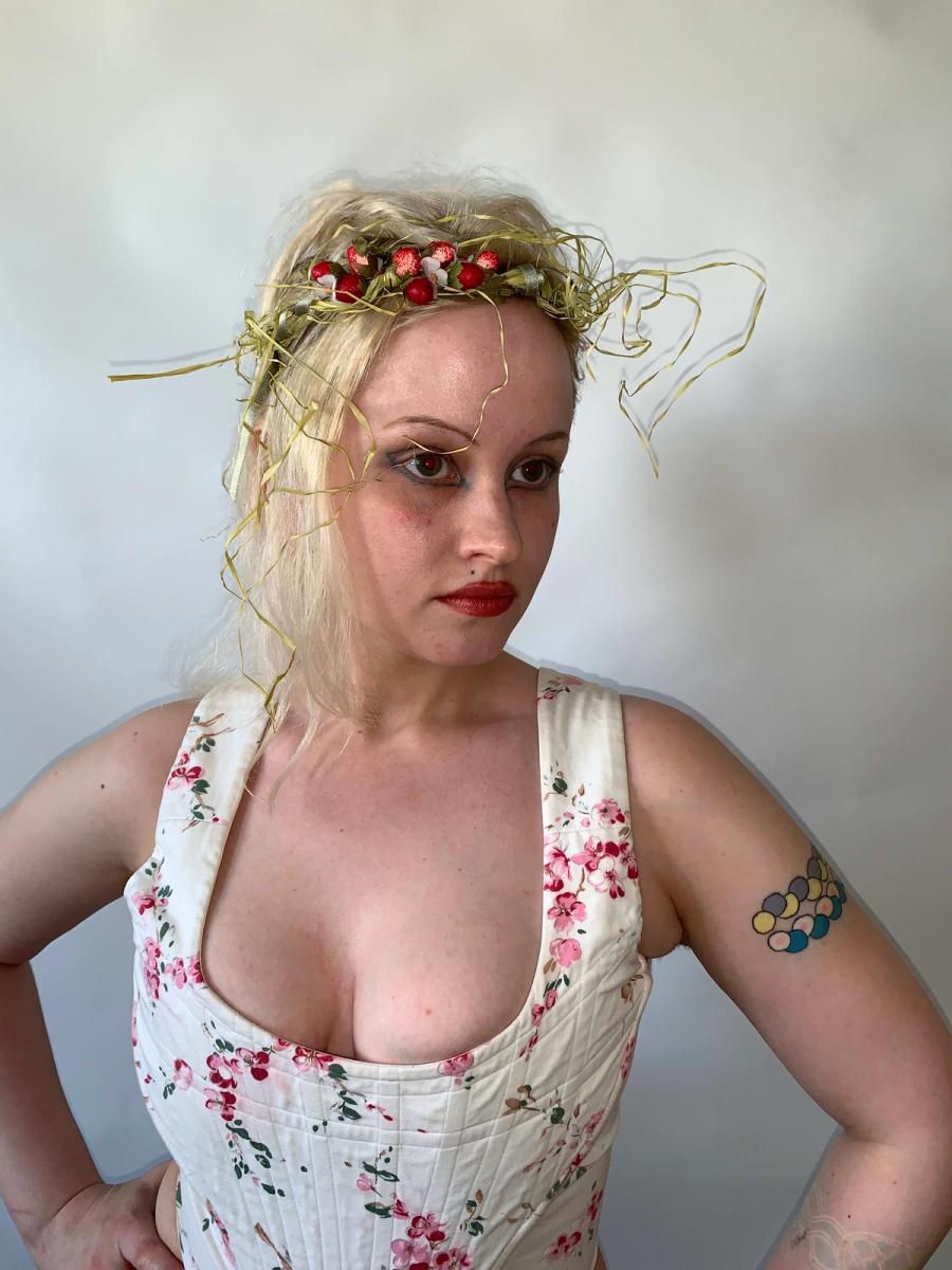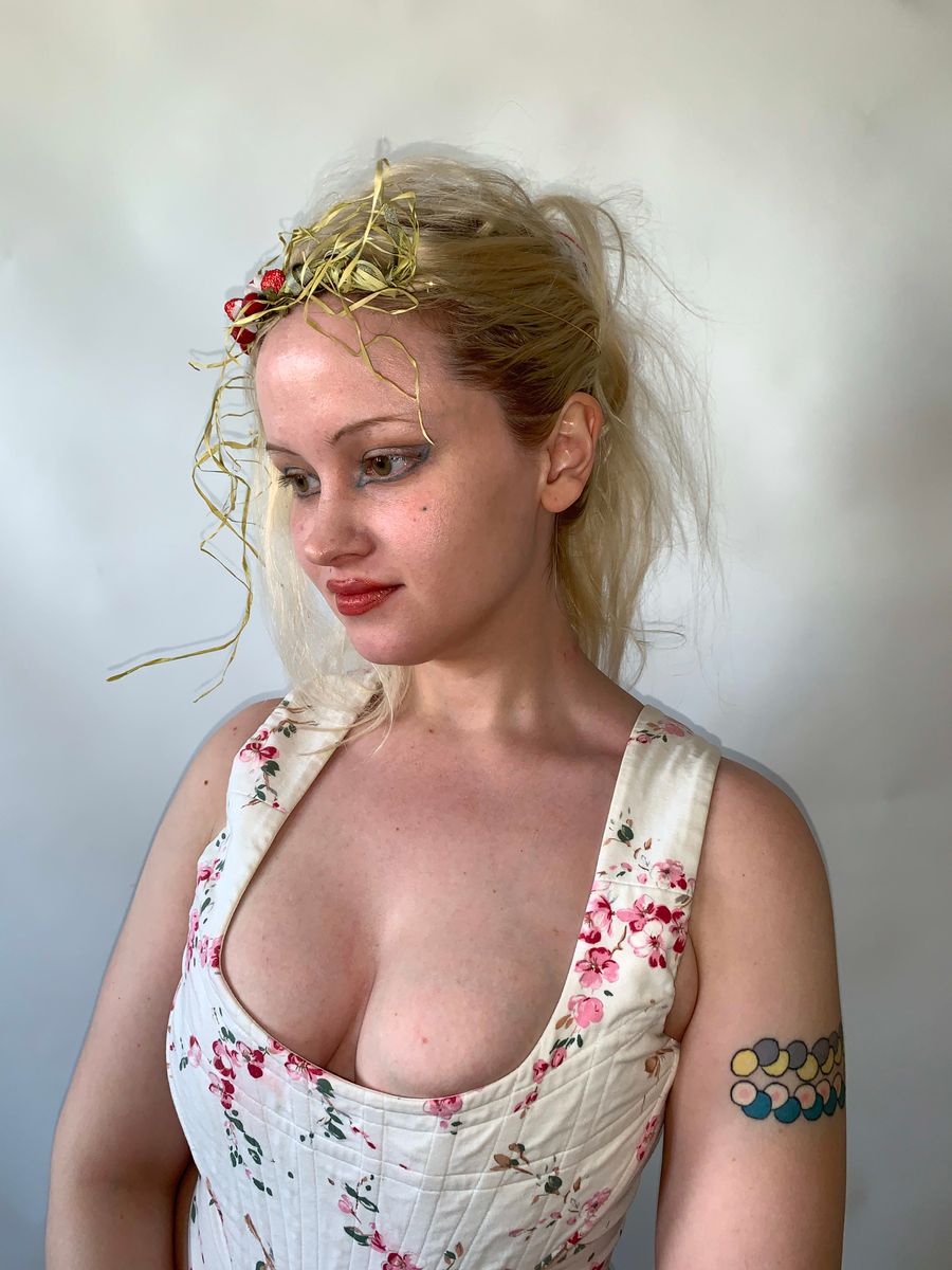 Unique and rare headpiece by Wonderful World presumably from the late 80s or 90s. There are beautiful iridescent berries and flowers amongst strands of raffia. The hair piece is fastened to the head with a light metal band. It comes in the original box! Truly a collector's piece.