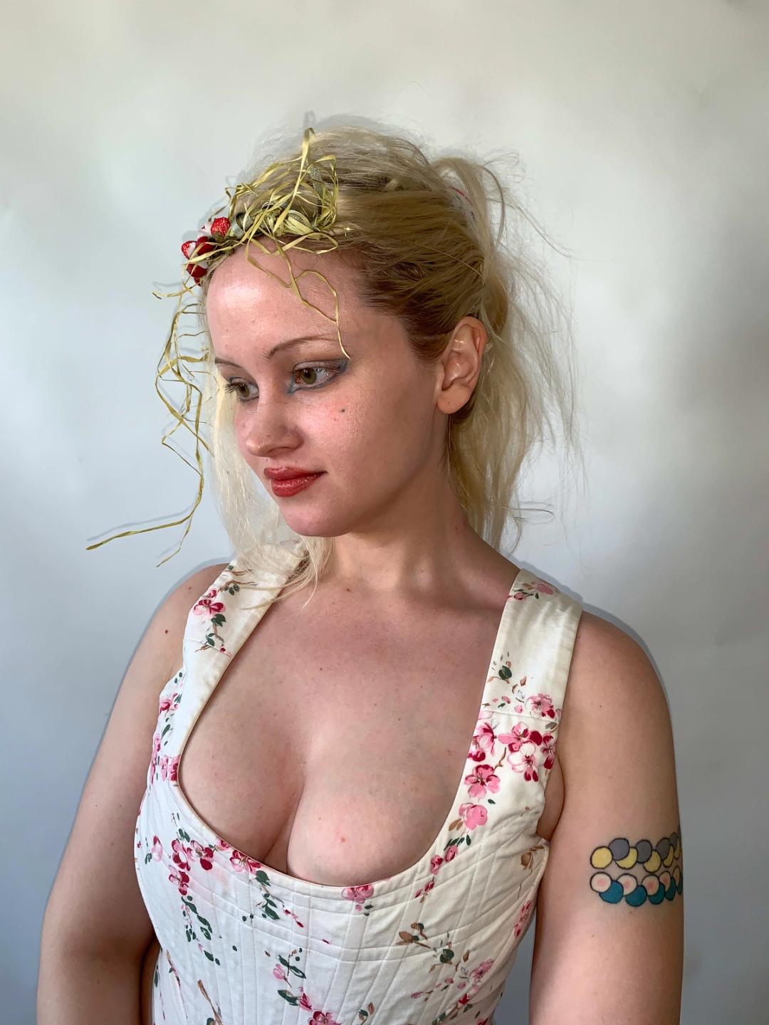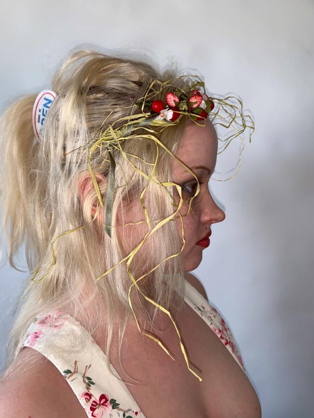 Unique and rare headpiece by Wonderful World presumably from the late 80s or 90s. There are beautiful iridescent berries and flowers amongst strands of raffia. The hair piece is fastened to the head with a light metal band. It comes in the original box! Truly a collector's piece.