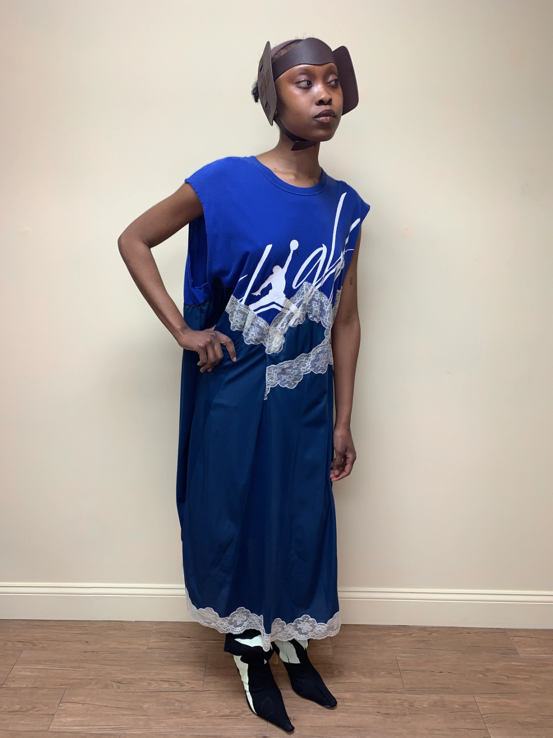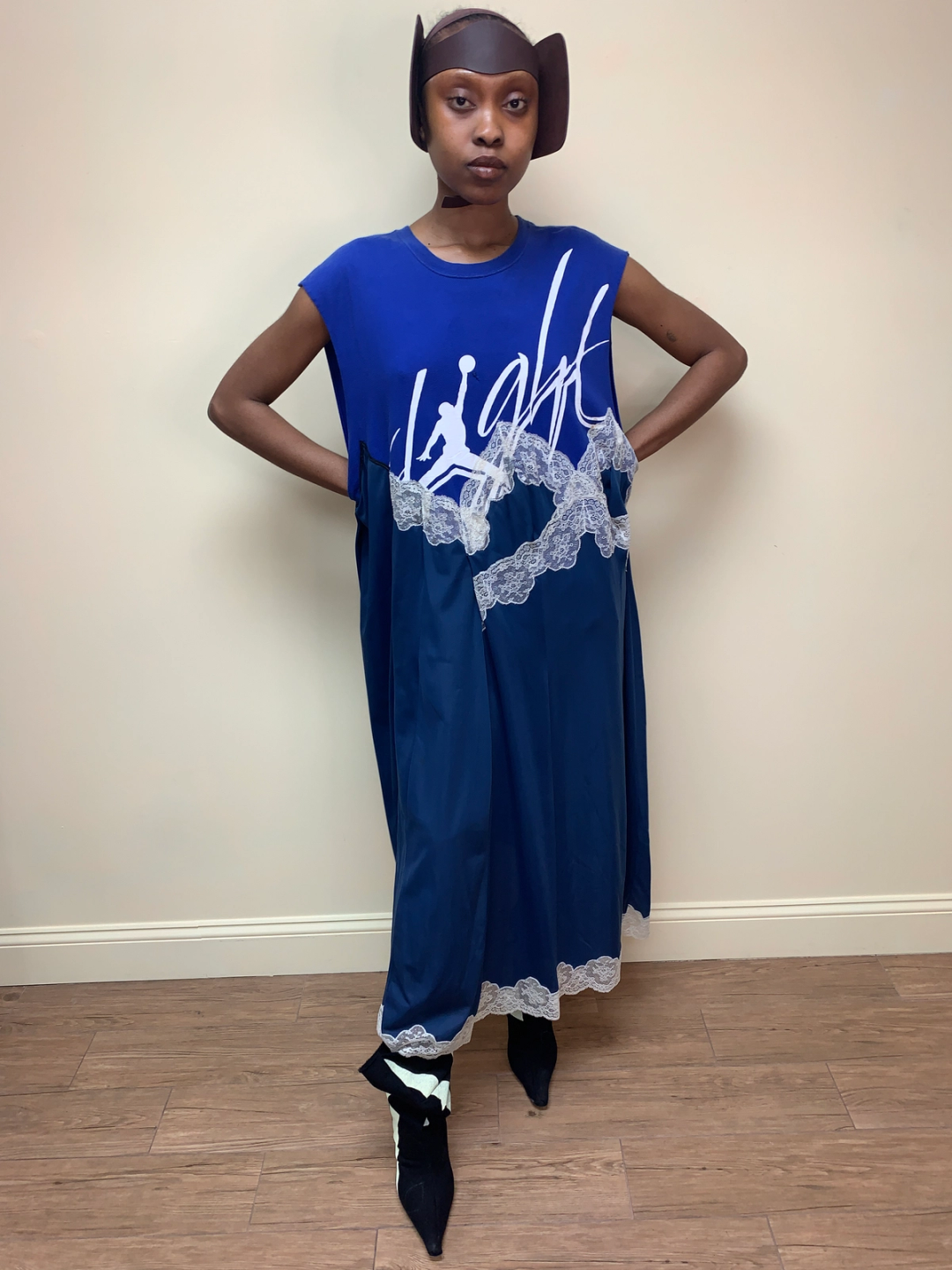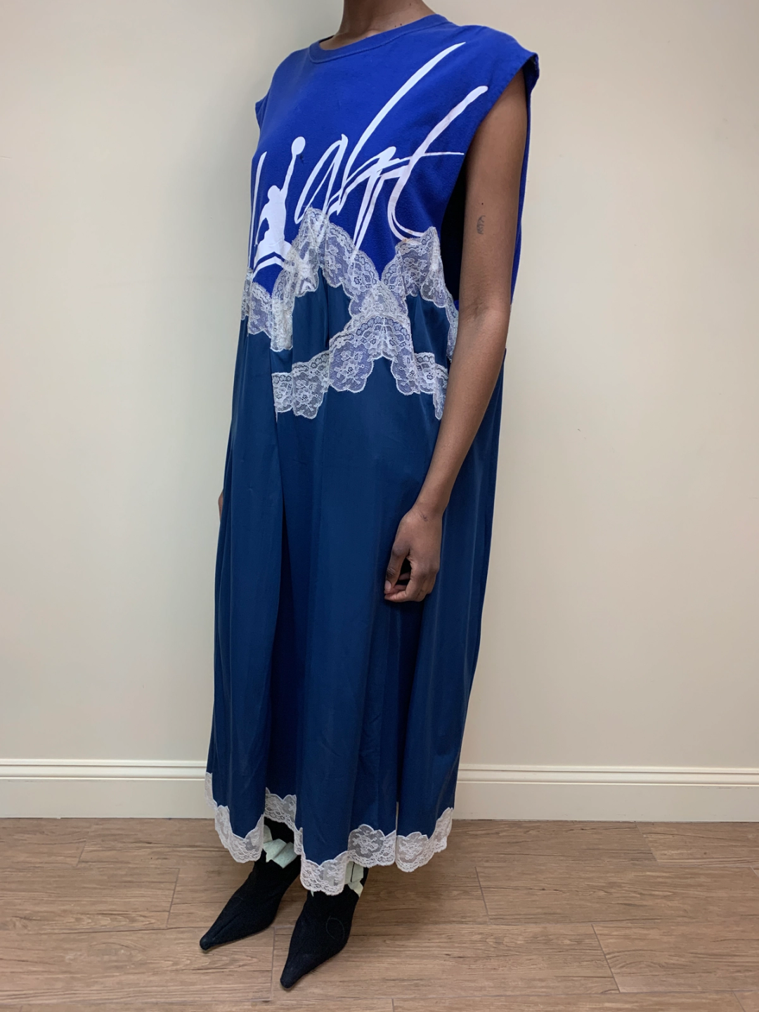 One of a kind dress by Yeah Right!! made of a Jordan t-shirt and vintage lingerie slips. The dress is a blue color and the composition is quite sculptural. Fairly open size. Unisex.