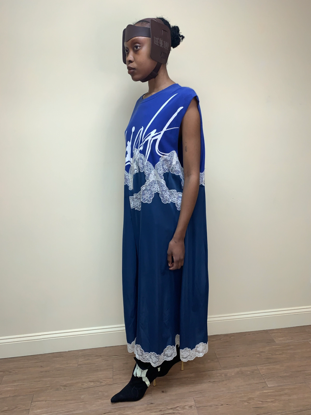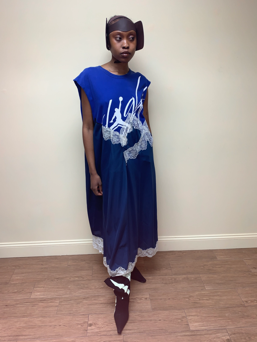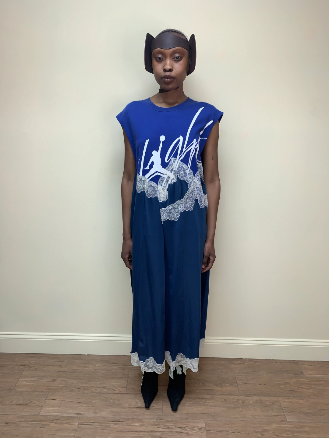 One of a kind dress by Yeah Right!! made of a Jordan t-shirt and vintage lingerie slips. The dress is a blue color and the composition is quite sculptural. Fairly open size. Unisex.