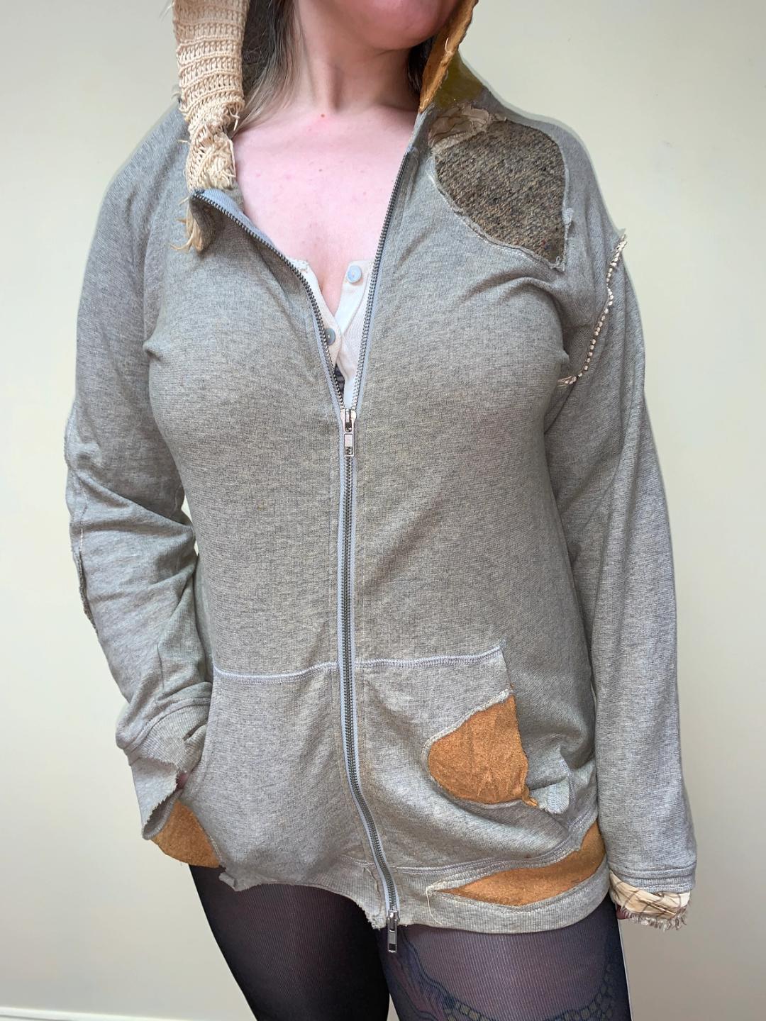 One-of-a-kind patchwork hooded sweatshirt by Japanese label, Yeah Right!! The sweatshirt has leather patches and a gold painted hood. Unisex.