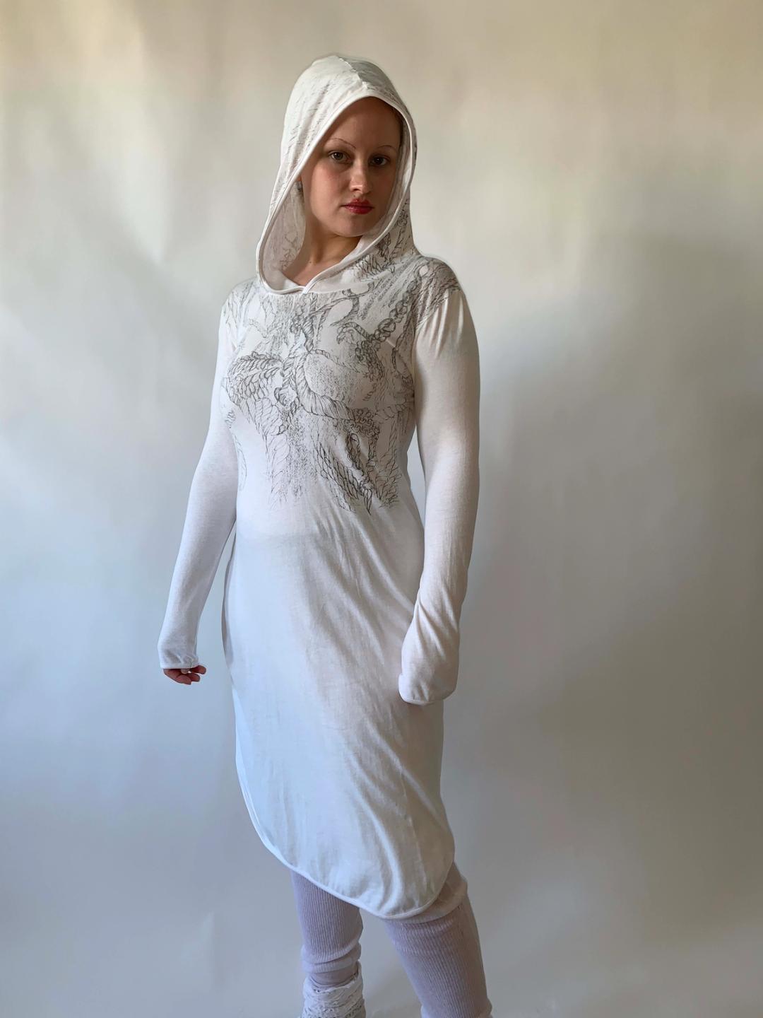 Gorgeous hooded dress by Yeah Right!!. The dress has a delicate drawn rope print throughout. It's made of a soft and lightweight stretch cotton. Could fit a variety of sizes due to its stretch.