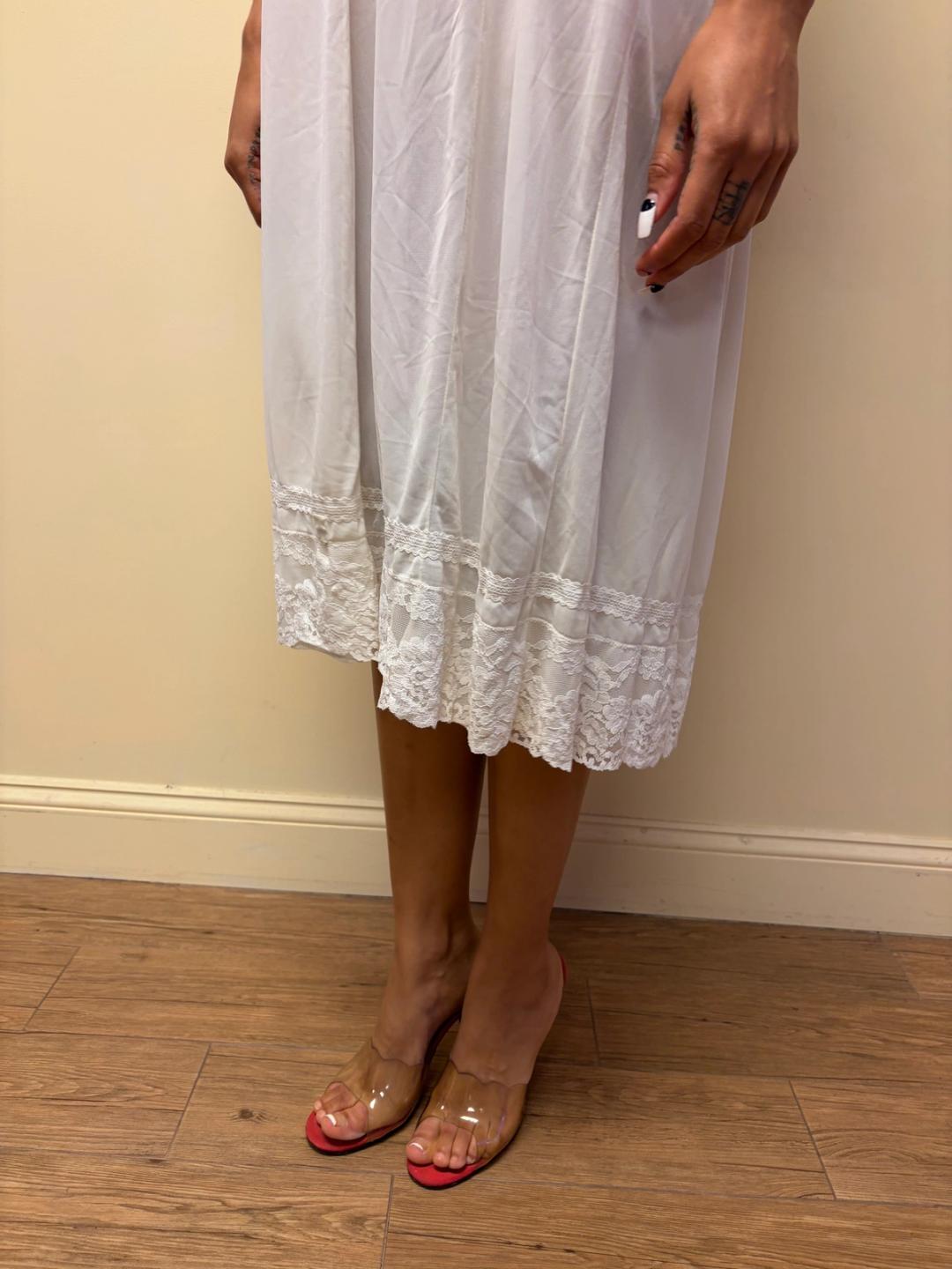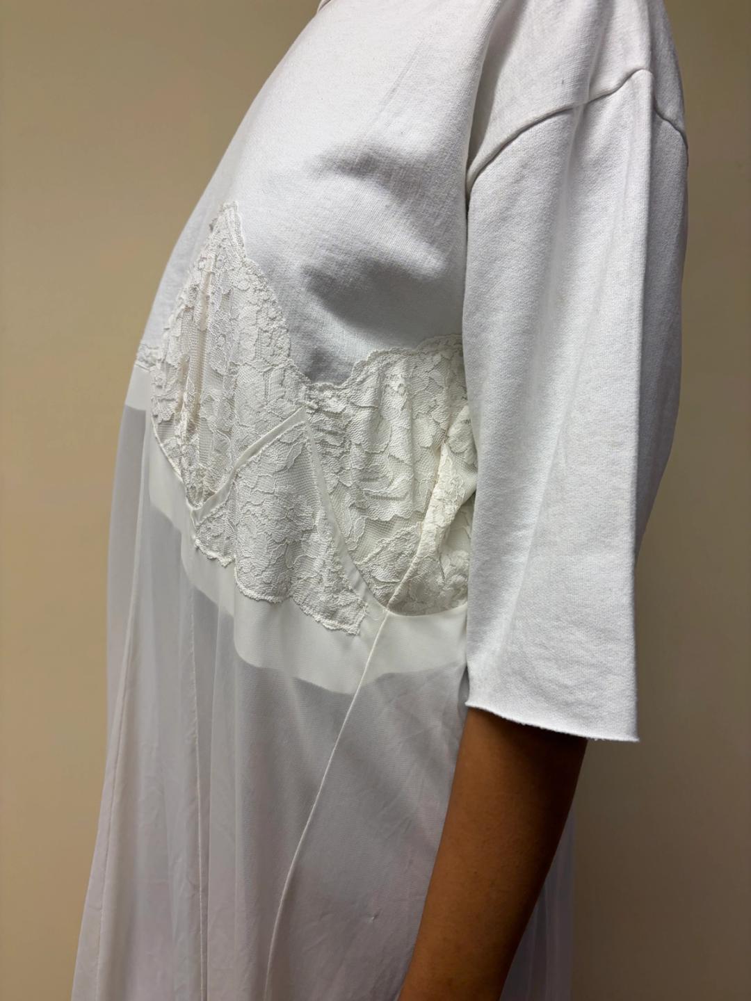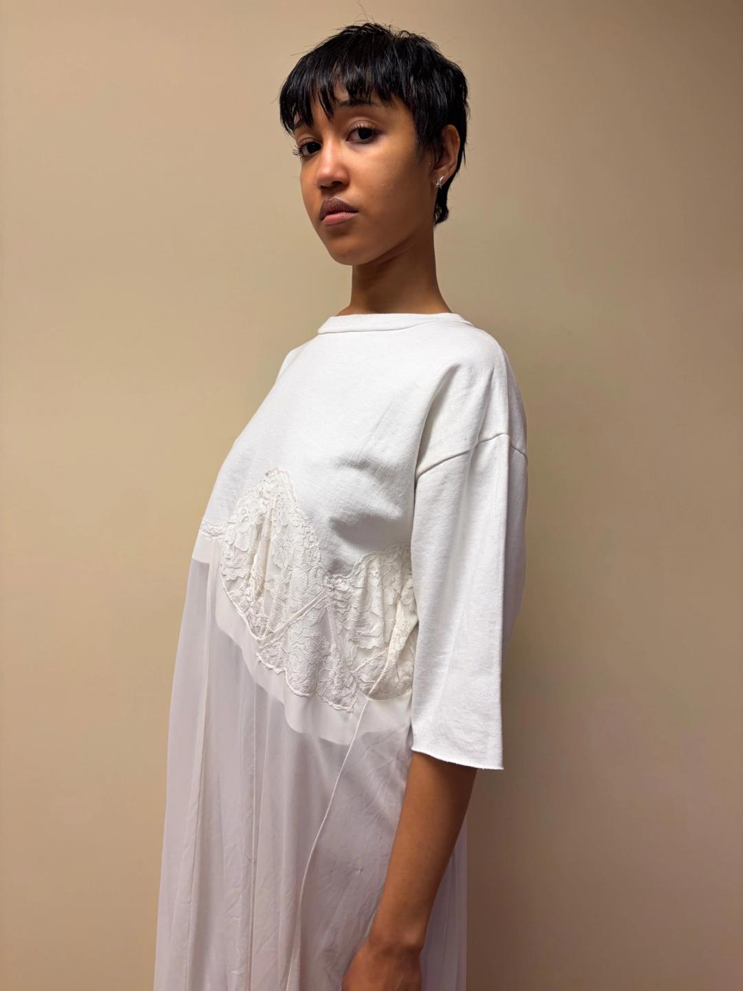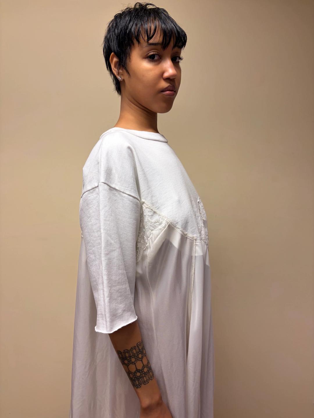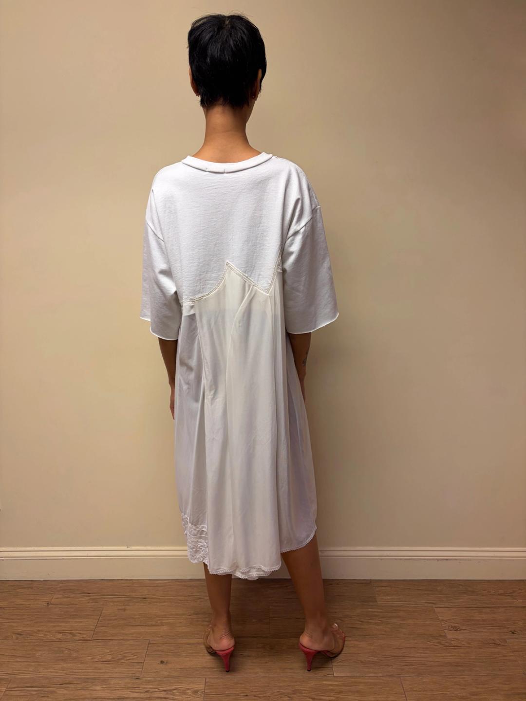 One of a kind dress by Yeah Right!! made of a sweatshirt and vintage lingerie slips. The dress has a slit on one side. The composition is quite sculptural. Fairly open size.