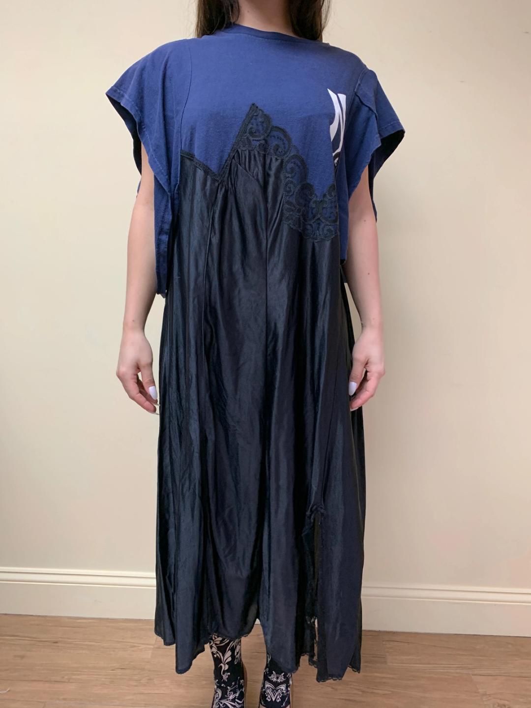 One of a kind dress by Yeah Right!! made of a New York Yankees t-shirt and a vintage lingerie slip. The dress is a navy blue color and the composition is quite sculptural. Fairly open size.