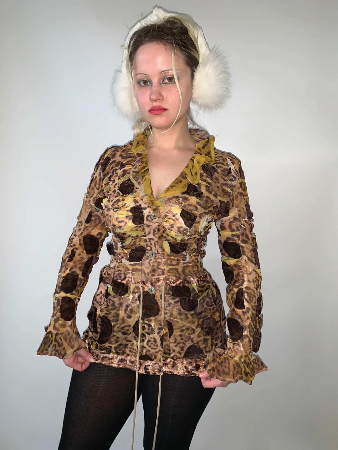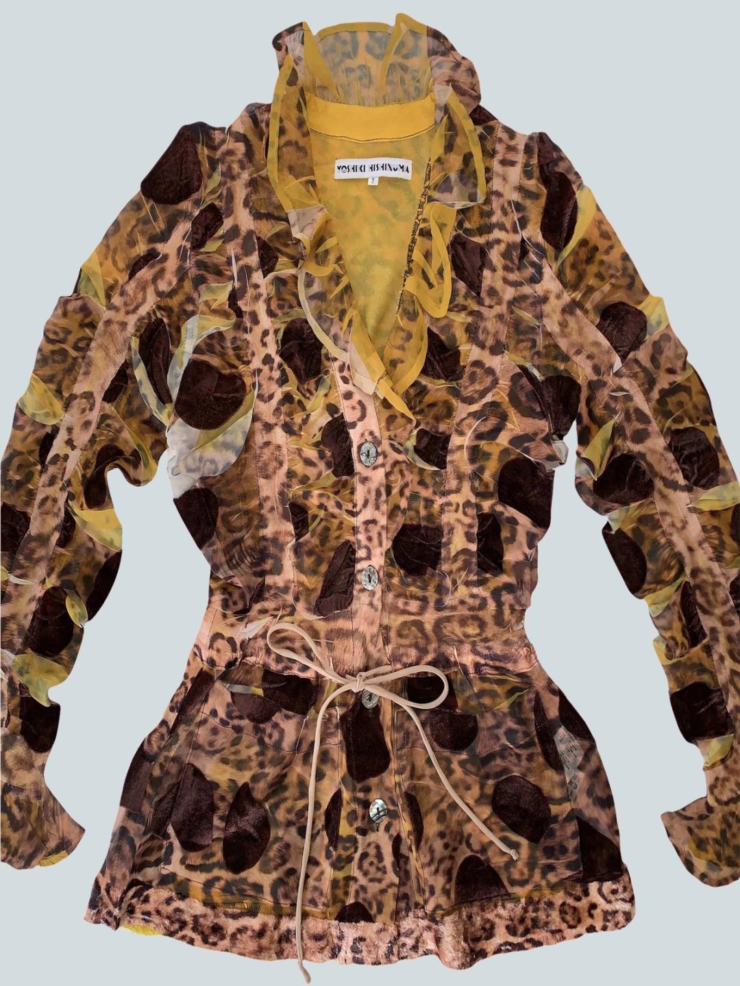 Gorgeous and rare leopard print button down shirt by Yoshiki Hishinuma. One of the most unique, truly couture garments! The top has unusual flocked velvet brown spots throughout, and a leopard velvet trim. Additionally, there is pleating and an irregular leopard print. The top is quite stretchy so it has a formfitting silhouette and can fit a variety of sizes. The drawstring waist band cinches the waist. There's even pockets!