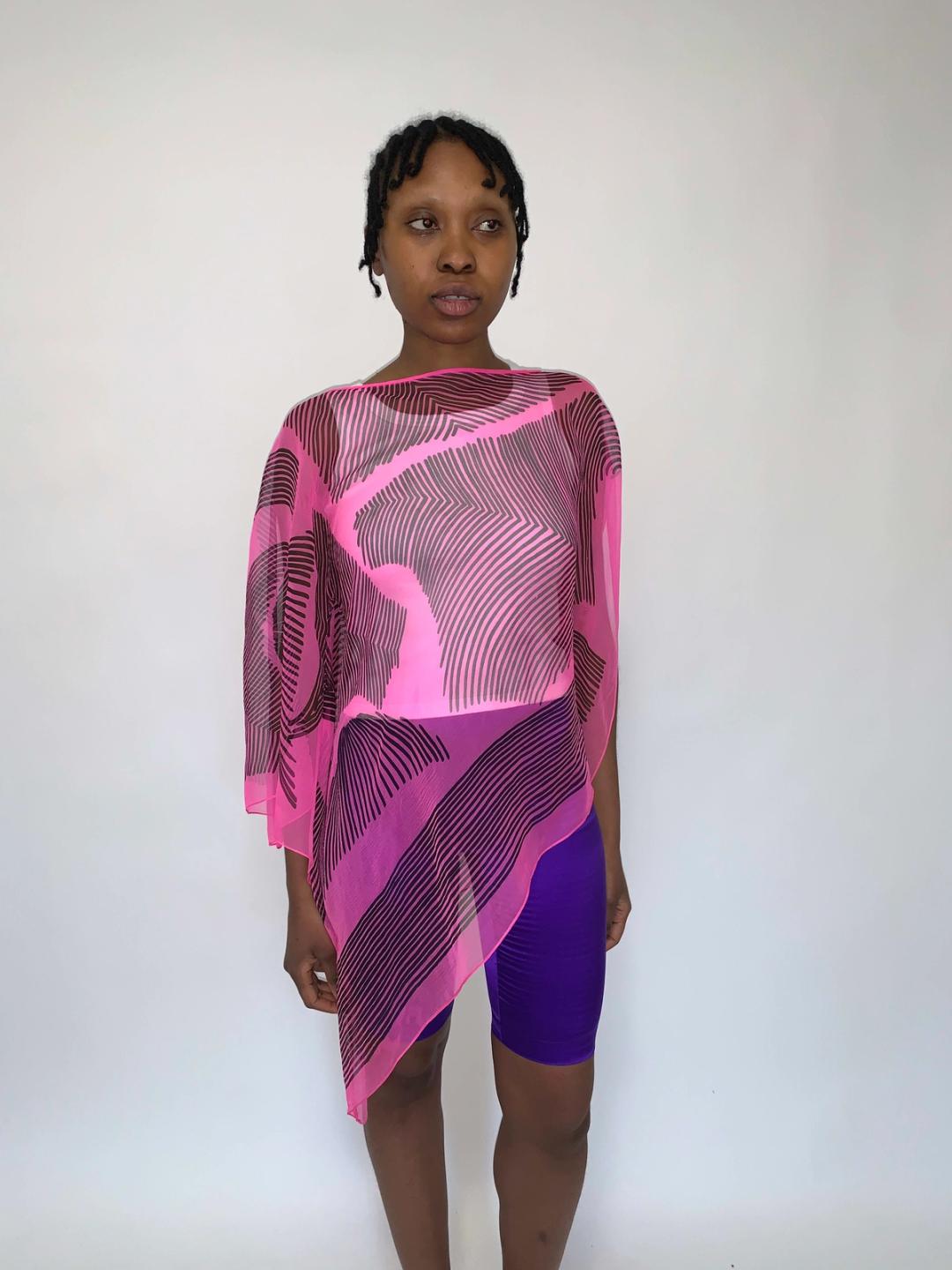 Zandra Rhodes asymmetrical silk chiffon tunic cut on the bias from the late 70s or 80s. In a really gorgeous bright hot pink color-way with an abstract, organic stripe pattern throughout. The top is in pristine condition.